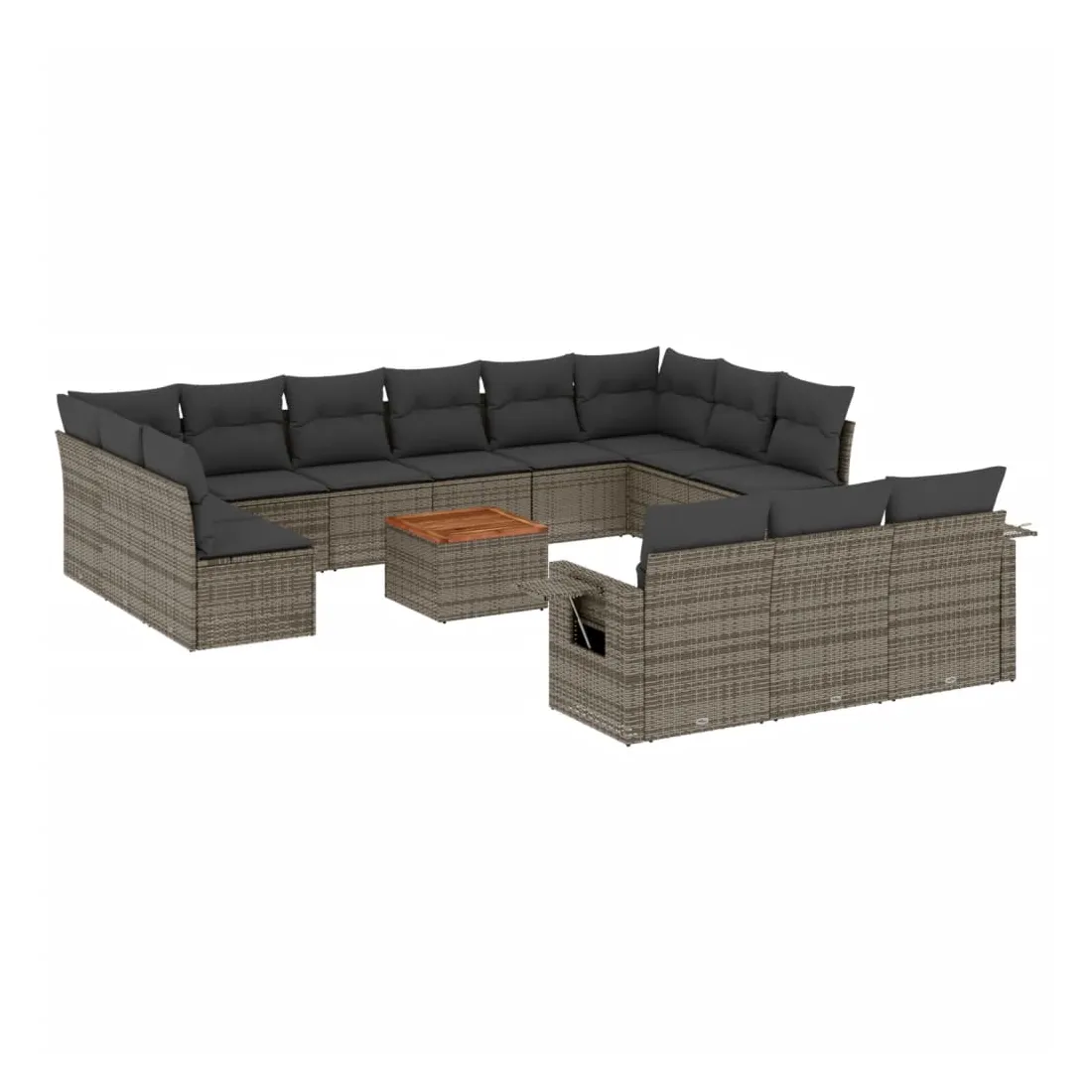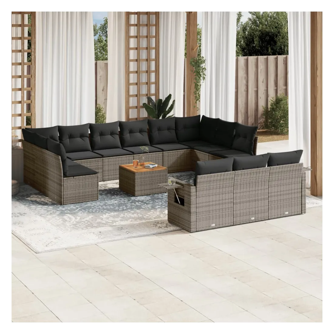 Cet ensemble de canapés de jardin est le complément parfait de votre arrière-cour, terrasse ou patio, offrant un espace confortable et accueillant pour discuter avec la famille et les amis ou simplement se détendre et profiter de l'extérieur. Matériau durable : la résine tressée, également connue sous le nom de poly rotin, est un matériau synthétique solide et nécessitant peu d'entretien qui ressemble au rotin naturel. Il est léger, facile à nettoyer et couramment utilisé pour les meubles d'extérieur en raison de sa durabilité et de ses propriétés de résistance aux intempéries.Fonction de rangement avec sac résistant à l'eau : chaque siège de jardin dispose d'un espace de rangement sous l'assise, complété par un sac résistant à l'eau pour ranger les coussins, les jouets et d'autres objets. Les sacs intérieurs sont dotés d'un couvercle et peuvent être solidement fixés aux sièges à l'aide de bandes auto-agrippantes pour plus de stabilité.Dessus stable et facile à nettoyer : cette table de jardin a un dessus en bois d'acacia robuste, durable et facile à nettoyer avec un chiffon humide.Table d'appoint pratique : ce mobilier d'extérieur comprend des tables d'appoint pliables avec un ressort à gaz sur les accoudoirs, offrant des endroits pratiques pour garder vos essentiels à portée de main.Conception modulaire : cet ensemble de meubles d'extérieur a une conception modulaire, ce qui le rend complètement flexible et facile à déplacer, afin que vous puissiez créer un agencement de meubles d'extérieur personnalisé. Bon à savoir :Pour que vos meubles d'extérieur restent beaux, nous vous recommandons de les protéger avec une housse imperméable.
