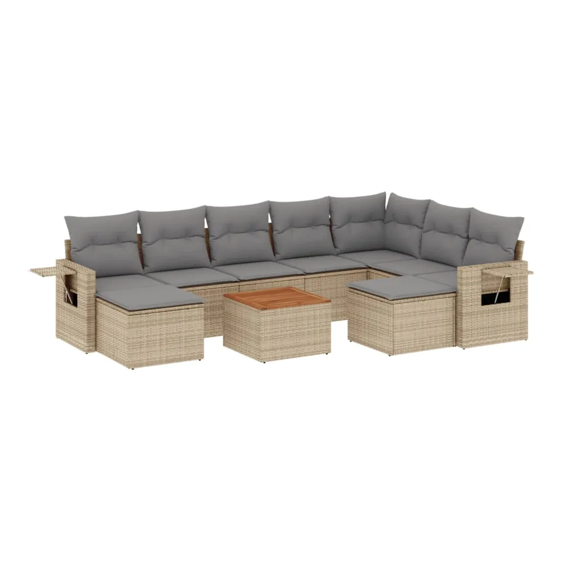 vidaXLCet ensemble de canapés de jardin est le complément parfait de votre arrière-cour, terrasse ou patio, offrant un espace confortable et accueillant pour discuter avec la famille et les amis ou simplement se détendre et profiter de l'extérieur. Matériau durable : la résine tressée, également connue sous le nom de poly rotin, est un matériau synthétique solide et nécessitant peu d'entretien qui ressemble au rotin naturel. Il est léger, facile à nettoyer et couramment utilisé pour les meubles d'extérieur en raison de sa durabilité et de ses propriétés de résistance aux intempéries.Fonction de rangement avec sac résistant à l'eau : chaque siège de jardin dispose d'un espace de rangement sous l'assise, complété par un sac résistant à l'eau pour ranger les coussins, les jouets et d'autres objets. Les sacs intérieurs sont dotés d'un couvercle et peuvent être solidement fixés aux sièges à l'aide de bandes auto-agrippantes pour plus de stabilité.Dessus stable et facile à nettoyer : cette table de jardin a un dessus en bois d'acacia robuste, durable et facile à nettoyer avec un chiffon humide.Table d'appoint pratique : ce mobilier d'extérieur comprend des tables d'appoint pliables avec un ressort à gaz sur les accoudoirs, offrant des endroits pratiques pour garder vos essentiels à portée de main.Conception modulaire : cet ensemble de meubles d'extérieur a une conception modulaire, ce qui le rend complètement flexible et facile à déplacer, afin que vous puissiez créer un agencement de meubles d'extérieur personnalisé. Bon à savoir :Pour que vos meubles d'extérieur restent beaux, nous vous recommandons de les protéger avec une housse imperméable.