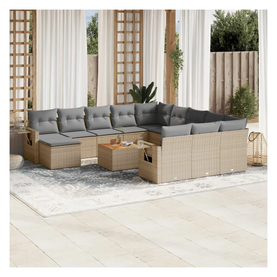 vidaXLCet ensemble de canapés de jardin est le complément parfait de votre arrière-cour, terrasse ou patio, offrant un espace confortable et accueillant pour discuter avec la famille et les amis ou simplement se détendre et profiter de l'extérieur. Matériau durable : la résine tressée, également connue sous le nom de poly rotin, est un matériau synthétique solide et nécessitant peu d'entretien qui ressemble au rotin naturel. Il est léger, facile à nettoyer et couramment utilisé pour les meubles d'extérieur en raison de sa durabilité et de ses propriétés de résistance aux intempéries.Fonction de rangement avec sac résistant à l'eau : chaque siège de jardin dispose d'un espace de rangement sous l'assise, complété par un sac résistant à l'eau pour ranger les coussins, les jouets et d'autres objets. Les sacs intérieurs sont dotés d'un couvercle et peuvent être solidement fixés aux sièges à l'aide de bandes auto-agrippantes pour plus de stabilité.Dessus stable et facile à nettoyer : cette table de jardin a un dessus en bois d'acacia robuste, durable et facile à nettoyer avec un chiffon humide.Table d'appoint pratique : ce mobilier d'extérieur comprend des tables d'appoint pliables avec un ressort à gaz sur les accoudoirs, offrant des endroits pratiques pour garder vos essentiels à portée de main.Conception modulaire : cet ensemble de meubles d'extérieur a une conception modulaire, ce qui le rend complètement flexible et facile à déplacer, afin que vous puissiez créer un agencement de meubles d'extérieur personnalisé. Bon à savoir :Pour que vos meubles d'extérieur restent beaux, nous vous recommandons de les protéger avec une housse imperméable.