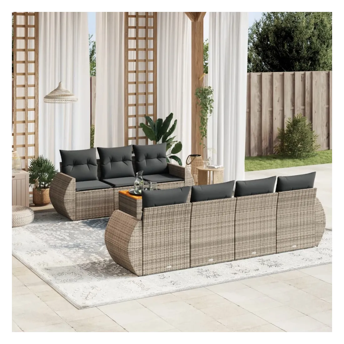 Cet ensemble de canapés de jardin est le complément parfait de votre arrière-cour, terrasse ou patio, offrant un espace confortable et accueillant pour discuter avec la famille et les amis ou simplement se détendre et profiter de l'extérieur. Matériau durable : la résine tressée, également connue sous le nom de poly rotin, est un matériau synthétique solide et nécessitant peu d'entretien qui ressemble au rotin naturel. Il est léger, facile à nettoyer et couramment utilisé pour les meubles d'extérieur en raison de sa durabilité et de ses propriétés de résistance aux intempéries.Dessus stable et facile à nettoyer : cette table de jardin a un dessus en bois d'acacia robuste, durable et facile à nettoyer avec un chiffon humide. Fonction de rangement avec sac résistant à l'eau : chaque siège de jardin dispose d'un espace de rangement sous l'assise, complété par un sac résistant à l'eau pour ranger les coussins, les jouets et d'autres objets. Les sacs intérieurs sont dotés d'un couvercle et peuvent être solidement fixés aux sièges à l'aide de bandes auto-agrippantes pour plus de stabilité.Expérience d'assise confortable : ce mobilier d'extérieur, doté de coussins épais, offre une expérience d'assise confortable.Conception modulaire : cet ensemble de meubles d'extérieur a une conception modulaire, ce qui le rend complètement flexible et facile à déplacer, afin que vous puissiez créer un agencement de meubles d'extérieur personnalisé. Bon à savoir :Pour que vos meubles d'extérieur restent beaux, nous vous recommandons de les protéger avec une housse imperméable.