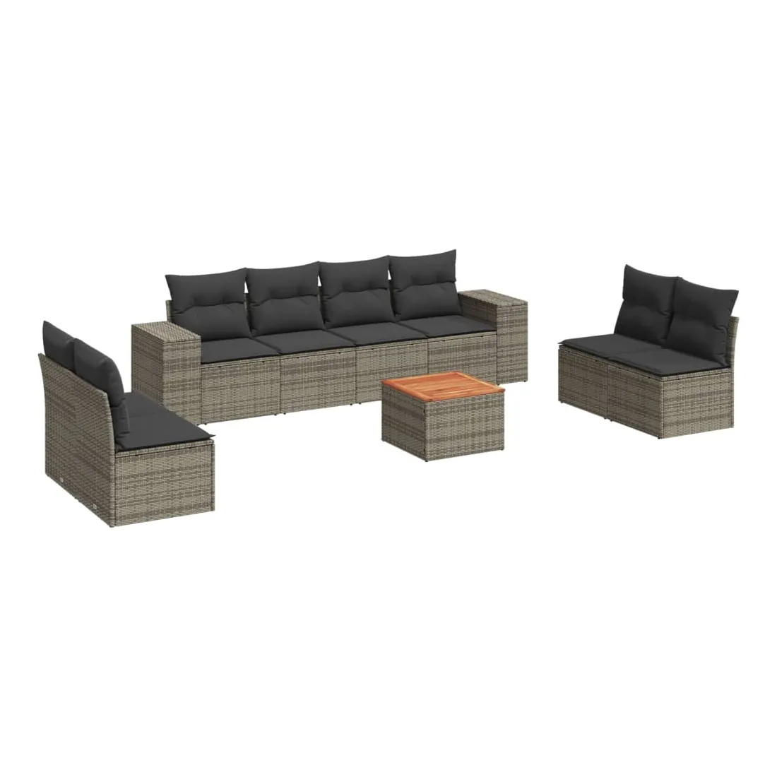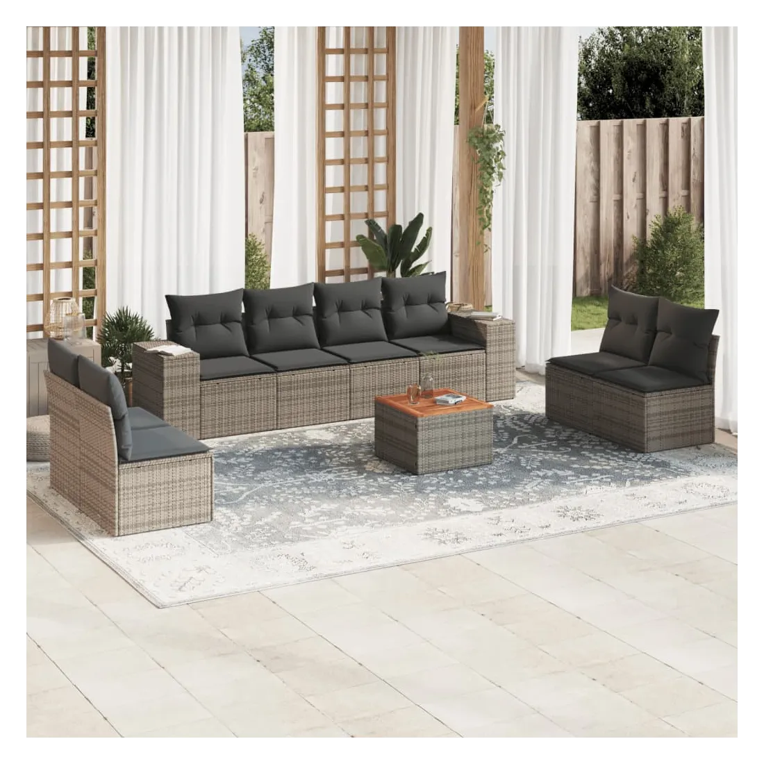 Cet ensemble de canapés de jardin est le complément parfait de votre arrière-cour, terrasse ou patio, offrant un espace confortable et accueillant pour discuter avec la famille et les amis ou simplement se détendre et profiter de l'extérieur. Matériau durable : la résine tressée, également connue sous le nom de poly rotin, est un matériau synthétique solide et nécessitant peu d'entretien qui ressemble au rotin naturel. Il est léger, facile à nettoyer et couramment utilisé pour les meubles d'extérieur en raison de sa durabilité et de ses propriétés de résistance aux intempéries. Fonction de rangement avec sac résistant à l'eau : chaque siège de jardin dispose d'un espace de rangement sous l'assise, complété par un sac résistant à l'eau pour ranger les coussins, les jouets et d'autres objets. Les sacs intérieurs sont dotés d'un couvercle et peuvent être solidement fixés aux sièges à l'aide de bandes auto-agrippantes pour plus de stabilité. Dessus stable et facile à nettoyer : cette table de jardin a un dessus en bois d'acacia robuste, durable et facile à nettoyer avec un chiffon humide. Expérience d'assise confortable : ce mobilier d'extérieur, doté de coussins épais, offre une expérience d'assise confortable. Conception modulaire : cet ensemble de meubles d'extérieur a une conception modulaire, ce qui le rend complètement flexible et facile à déplacer, afin que vous puissiez créer un agencement de meubles d'extérieur personnalisé. Bon à savoir :Pour que vos meubles d'extérieur restent beaux, nous vous recommandons de les protéger avec une housse imperméable.