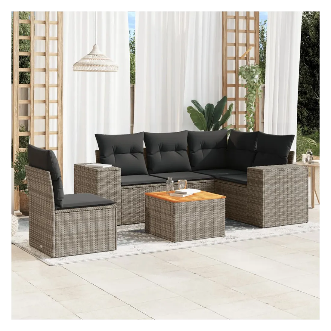 Cet ensemble de canapés de jardin est le complément parfait de votre arrière-cour, terrasse ou patio, offrant un espace confortable et accueillant pour discuter avec la famille et les amis ou simplement se détendre et profiter de l'extérieur. Matériau durable : la résine tressée, également connue sous le nom de poly rotin, est un matériau synthétique solide et nécessitant peu d'entretien qui ressemble au rotin naturel. Il est léger, facile à nettoyer et couramment utilisé pour les meubles d'extérieur en raison de sa durabilité et de ses propriétés de résistance aux intempéries.Dessus stable et facile à nettoyer : cette table de jardin a un dessus en bois d'acacia robuste, durable et facile à nettoyer avec un chiffon humide. Fonction de rangement avec sac résistant à l'eau : chaque siège de jardin dispose d'un espace de rangement sous l'assise, complété par un sac résistant à l'eau pour ranger les coussins, les jouets et d'autres objets. Les sacs intérieurs sont dotés d'un couvercle et peuvent être solidement fixés aux sièges à l'aide de bandes auto-agrippantes pour plus de stabilité.Expérience d'assise confortable : ce mobilier d'extérieur, doté de coussins épais, offre une expérience d'assise confortable.Conception modulaire : cet ensemble de meubles d'extérieur a une conception modulaire, ce qui le rend complètement flexible et facile à déplacer, afin que vous puissiez créer un agencement de meubles d'extérieur personnalisé. Bon à savoir :Pour que vos meubles d'extérieur restent beaux, nous vous recommandons de les protéger avec une housse imperméable.