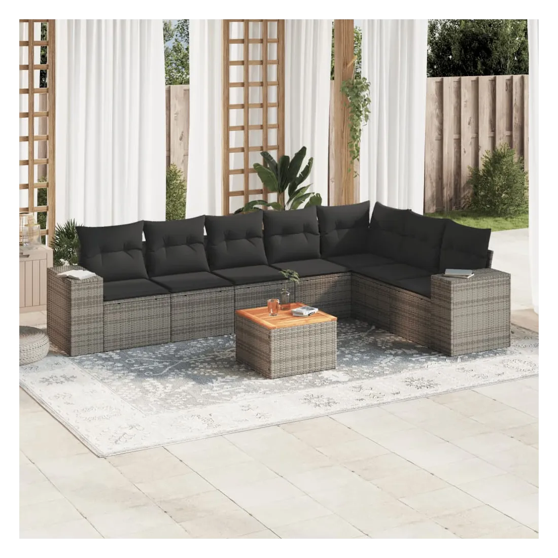 Cet ensemble de canapés de jardin est le complément parfait de votre arrière-cour, terrasse ou patio, offrant un espace confortable et accueillant pour discuter avec la famille et les amis ou simplement se détendre et profiter de l'extérieur. Matériau durable : la résine tressée, également connue sous le nom de poly rotin, est un matériau synthétique solide et nécessitant peu d'entretien qui ressemble au rotin naturel. Il est léger, facile à nettoyer et couramment utilisé pour les meubles d'extérieur en raison de sa durabilité et de ses propriétés de résistance aux intempéries. Fonction de rangement avec sac résistant à l'eau : chaque siège de jardin dispose d'un espace de rangement sous l'assise, complété par un sac résistant à l'eau pour ranger les coussins, les jouets et d'autres objets. Les sacs intérieurs sont dotés d'un couvercle et peuvent être solidement fixés aux sièges à l'aide de bandes auto-agrippantes pour plus de stabilité. Dessus stable et facile à nettoyer : cette table de jardin a un dessus en bois d'acacia robuste, durable et facile à nettoyer avec un chiffon humide. Expérience d'assise confortable : ce mobilier d'extérieur, doté de coussins épais, offre une expérience d'assise confortable. Conception modulaire : cet ensemble de meubles d'extérieur a une conception modulaire, ce qui le rend complètement flexible et facile à déplacer, afin que vous puissiez créer un agencement de meubles d'extérieur personnalisé. Bon à savoir :Pour que vos meubles d'extérieur restent beaux, nous vous recommandons de les protéger avec une housse imperméable.