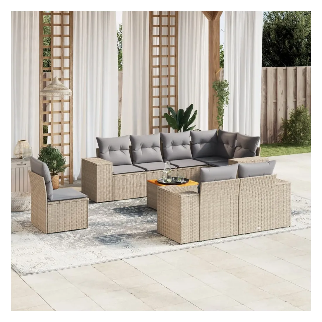 Cet ensemble de canapés de jardin est le complément parfait de votre arrière-cour, terrasse ou patio, offrant un espace confortable et accueillant pour discuter avec la famille et les amis ou simplement se détendre et profiter de l'extérieur. Matériau durable : la résine tressée, également connue sous le nom de poly rotin, est un matériau synthétique solide et nécessitant peu d'entretien qui ressemble au rotin naturel. Il est léger, facile à nettoyer et couramment utilisé pour les meubles d'extérieur en raison de sa durabilité et de ses propriétés de résistance aux intempéries.Dessus stable et facile à nettoyer : cette table de jardin a un dessus en bois d'acacia robuste, durable et facile à nettoyer avec un chiffon humide. Fonction de rangement avec sac résistant à l'eau : chaque siège de jardin dispose d'un espace de rangement sous l'assise, complété par un sac résistant à l'eau pour ranger les coussins, les jouets et d'autres objets. Les sacs intérieurs sont dotés d'un couvercle et peuvent être solidement fixés aux sièges à l'aide de bandes auto-agrippantes pour plus de stabilité.Expérience d'assise confortable : ce mobilier d'extérieur, doté de coussins épais, offre une expérience d'assise confortable.Conception modulaire : cet ensemble de meubles d'extérieur a une conception modulaire, ce qui le rend complètement flexible et facile à déplacer, afin que vous puissiez créer un agencement de meubles d'extérieur personnalisé. Bon à savoir :Pour que vos meubles d'extérieur restent beaux, nous vous recommandons de les protéger avec une housse imperméable.
