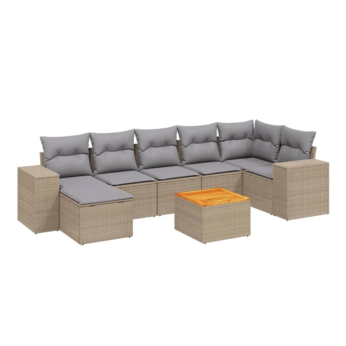 Cet ensemble de canapés de jardin est le complément parfait de votre arrière-cour, terrasse ou patio, offrant un espace confortable et accueillant pour discuter avec la famille et les amis ou simplement se détendre et profiter de l'extérieur. Matériau durable : la résine tressée, également connue sous le nom de poly rotin, est un matériau synthétique solide et nécessitant peu d'entretien qui ressemble au rotin naturel. Il est léger, facile à nettoyer et couramment utilisé pour les meubles d'extérieur en raison de sa durabilité et de ses propriétés de résistance aux intempéries.Dessus stable et facile à nettoyer : cette table de jardin a un dessus en bois d'acacia robuste, durable et facile à nettoyer avec un chiffon humide. Fonction de rangement avec sac résistant à l'eau : chaque siège de jardin dispose d'un espace de rangement sous l'assise, complété par un sac résistant à l'eau pour ranger les coussins, les jouets et d'autres objets. Les sacs intérieurs sont dotés d'un couvercle et peuvent être solidement fixés aux sièges à l'aide de bandes auto-agrippantes pour plus de stabilité.Expérience d'assise confortable : ce mobilier d'extérieur, doté de coussins épais, offre une expérience d'assise confortable.Conception modulaire : cet ensemble de meubles d'extérieur a une conception modulaire, ce qui le rend complètement flexible et facile à déplacer, afin que vous puissiez créer un agencement de meubles d'extérieur personnalisé. Bon à savoir :Pour que vos meubles d'extérieur restent beaux, nous vous recommandons de les protéger avec une housse imperméable.