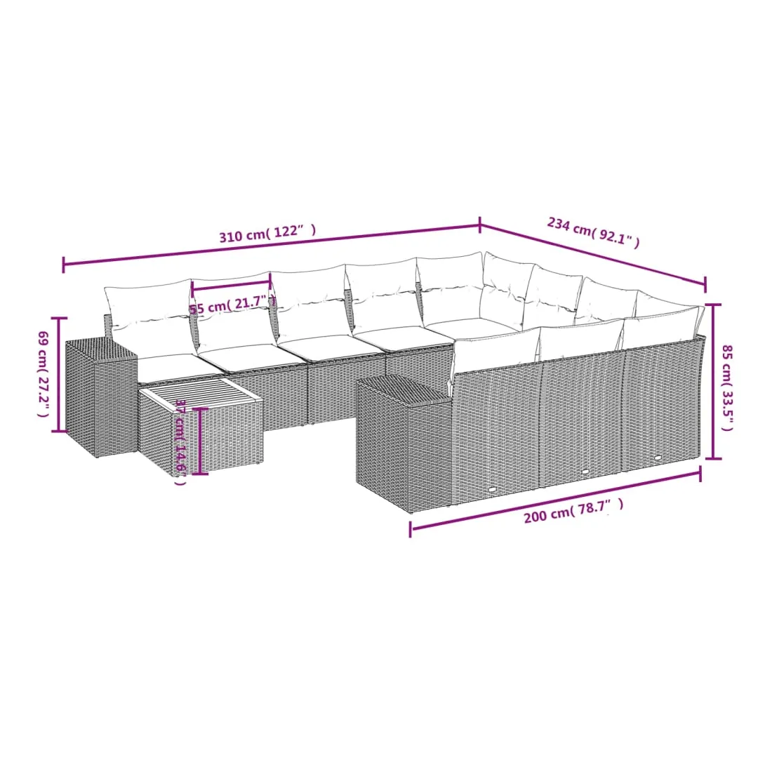 Cet ensemble de canapés de jardin est le complément parfait de votre arrière-cour, terrasse ou patio, offrant un espace confortable et accueillant pour discuter avec la famille et les amis ou simplement se détendre et profiter de l'extérieur. Matériau durable : la résine tressée, également connue sous le nom de poly rotin, est un matériau synthétique solide et nécessitant peu d'entretien qui ressemble au rotin naturel. Il est léger, facile à nettoyer et couramment utilisé pour les meubles d'extérieur en raison de sa durabilité et de ses propriétés de résistance aux intempéries.Dessus stable et facile à nettoyer : cette table de jardin a un dessus en bois d'acacia robuste, durable et facile à nettoyer avec un chiffon humide. Fonction de rangement avec sac résistant à l'eau : chaque siège de jardin dispose d'un espace de rangement sous l'assise, complété par un sac résistant à l'eau pour ranger les coussins, les jouets et d'autres objets. Les sacs intérieurs sont dotés d'un couvercle et peuvent être solidement fixés aux sièges à l'aide de bandes auto-agrippantes pour plus de stabilité.Expérience d'assise confortable : ce mobilier d'extérieur, doté de coussins épais, offre une expérience d'assise confortable.Conception modulaire : cet ensemble de meubles d'extérieur a une conception modulaire, ce qui le rend complètement flexible et facile à déplacer, afin que vous puissiez créer un agencement de meubles d'extérieur personnalisé. Bon à savoir :Pour que vos meubles d'extérieur restent beaux, nous vous recommandons de les protéger avec une housse imperméable.