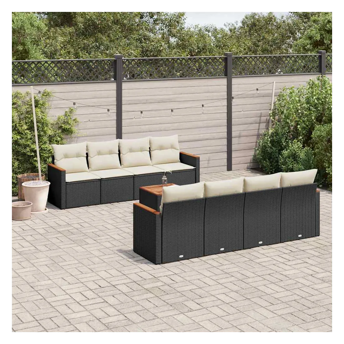 Cet ensemble de canapés de jardin est le complément parfait de votre arrière-cour, terrasse ou patio, offrant un espace confortable et accueillant pour discuter avec la famille et les amis ou simplement se détendre et profiter de l'extérieur. Matériau durable : la résine tressée, également connue sous le nom de poly rotin, est un matériau synthétique solide et nécessitant peu d'entretien qui ressemble au rotin naturel. Il est léger, facile à nettoyer et couramment utilisé pour les meubles d'extérieur en raison de sa durabilité et de ses propriétés de résistance aux intempéries.Fonction de rangement avec sac résistant à l'eau : le mobilier de jardin dispose d'un espace de rangement sous l'assise, complété par un sac résistant à l'eau pour ranger coussins, jouets et autres objets. Le sac intérieur peut être solidement fixé au mobilier d'extérieur grâce à des attaches auto-agrippantes pour plus de stabilité.Dessus stable et facile à nettoyer : cette table de jardin a un dessus en bois d'acacia robuste, durable et facile à nettoyer avec un chiffon humide.Housse amovible et lavable : ces coussins de siège sont dotés de housses amovibles pour un lavage et un entretien faciles.Conception modulaire : cet ensemble de meubles d'extérieur a une conception modulaire, ce qui le rend complètement flexible et facile à déplacer, afin que vous puissiez créer un agencement de meubles d'extérieur personnalisé. Bon à savoir :Pour que vos meubles d'extérieur restent beaux, nous vous recommandons de les protéger avec une housse imperméable.