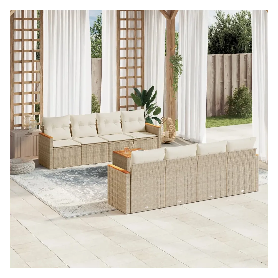 Cet ensemble de canapés de jardin est le complément parfait de votre arrière-cour, terrasse ou patio, offrant un espace confortable et accueillant pour discuter avec la famille et les amis ou simplement se détendre et profiter de l'extérieur. Matériau durable : la résine tressée, également connue sous le nom de poly rotin, est un matériau synthétique solide et nécessitant peu d'entretien qui ressemble au rotin naturel. Il est léger, facile à nettoyer et couramment utilisé pour les meubles d'extérieur en raison de sa durabilité et de ses propriétés de résistance aux intempéries.Fonction de rangement avec sac résistant à l'eau : le mobilier de jardin dispose d'un espace de rangement sous l'assise, complété par un sac résistant à l'eau pour ranger coussins, jouets et autres objets. Le sac intérieur peut être solidement fixé au mobilier d'extérieur grâce à des attaches auto-agrippantes pour plus de stabilité.Dessus stable et facile à nettoyer : cette table de jardin a un dessus en bois d'acacia robuste, durable et facile à nettoyer avec un chiffon humide.Housse amovible et lavable : ces coussins de siège sont dotés de housses amovibles pour un lavage et un entretien faciles.Conception modulaire : cet ensemble de meubles d'extérieur a une conception modulaire, ce qui le rend complètement flexible et facile à déplacer, afin que vous puissiez créer un agencement de meubles d'extérieur personnalisé. Bon à savoir :Pour que vos meubles d'extérieur restent beaux, nous vous recommandons de les protéger avec une housse imperméable.