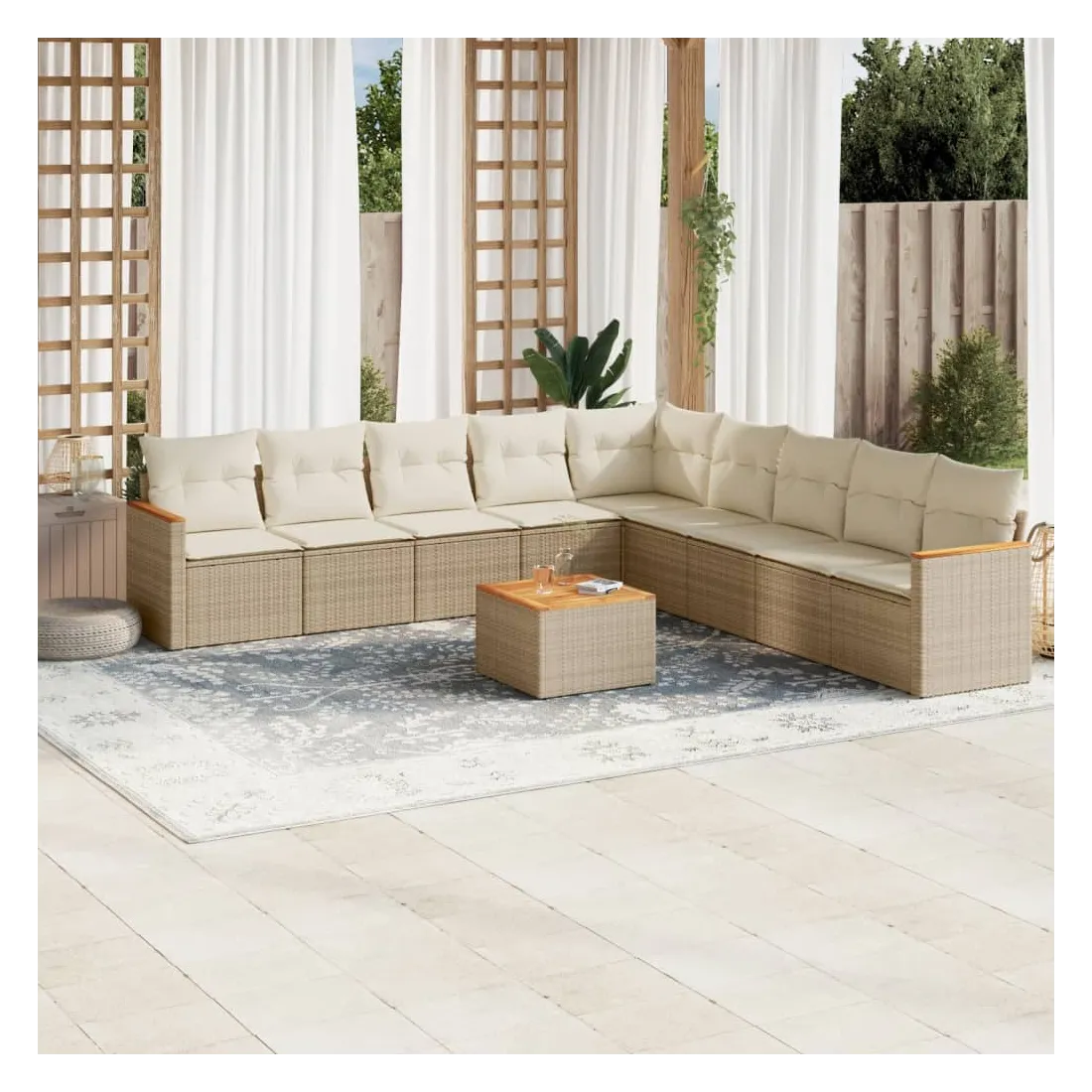 Cet ensemble de canapés de jardin est le complément parfait de votre arrière-cour, terrasse ou patio, offrant un espace confortable et accueillant pour discuter avec la famille et les amis ou simplement se détendre et profiter de l'extérieur. Matériau durable : la résine tressée, également connue sous le nom de poly rotin, est un matériau synthétique solide et nécessitant peu d'entretien qui ressemble au rotin naturel. Il est léger, facile à nettoyer et couramment utilisé pour les meubles d'extérieur en raison de sa durabilité et de ses propriétés de résistance aux intempéries.Fonction de rangement avec sac résistant à l'eau : le mobilier de jardin dispose d'un espace de rangement sous l'assise, complété par un sac résistant à l'eau pour ranger coussins, jouets et autres objets. Le sac intérieur peut être solidement fixé au mobilier d'extérieur grâce à des attaches auto-agrippantes pour plus de stabilité.Dessus stable et facile à nettoyer : cette table de jardin a un dessus en bois d'acacia robuste, durable et facile à nettoyer avec un chiffon humide.Housse amovible et lavable : ces coussins de siège sont dotés de housses amovibles pour un lavage et un entretien faciles.Conception modulaire : cet ensemble de meubles d'extérieur a une conception modulaire, ce qui le rend complètement flexible et facile à déplacer, afin que vous puissiez créer un agencement de meubles d'extérieur personnalisé. Bon à savoir :Pour que vos meubles d'extérieur restent beaux, nous vous recommandons de les protéger avec une housse imperméable.