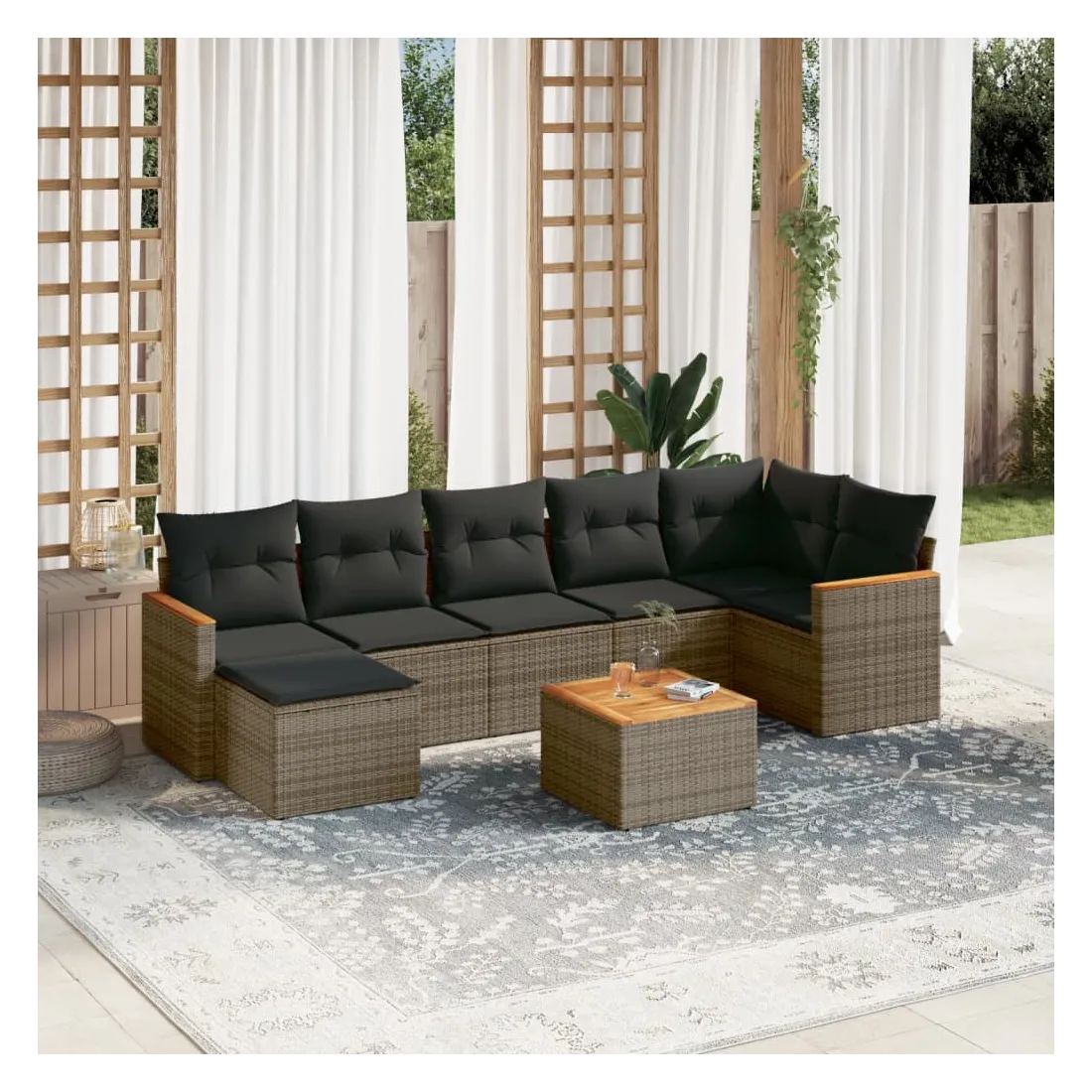 Cet ensemble de canapés de jardin est le complément parfait de votre arrière-cour, terrasse ou patio, offrant un espace confortable et accueillant pour discuter avec la famille et les amis ou simplement se détendre et profiter de l'extérieur. Matériau durable : la résine tressée, également connue sous le nom de poly rotin, est un matériau synthétique solide et nécessitant peu d'entretien qui ressemble au rotin naturel. Il est léger, facile à nettoyer et couramment utilisé pour les meubles d'extérieur en raison de sa durabilité et de ses propriétés de résistance aux intempéries.Fonction de rangement avec sac résistant à l'eau : le mobilier de jardin dispose d'un espace de rangement sous l'assise, complété par un sac résistant à l'eau pour ranger coussins, jouets et autres objets. Le sac intérieur peut être solidement fixé au mobilier d'extérieur grâce à des attaches auto-agrippantes pour plus de stabilité.Dessus stable et facile à nettoyer : cette table de jardin a un dessus en bois d'acacia robuste, durable et facile à nettoyer avec un chiffon humide.Housse amovible et lavable : ces coussins de siège sont dotés de housses amovibles pour un lavage et un entretien faciles.Conception modulaire : cet ensemble de meubles d'extérieur a une conception modulaire, ce qui le rend complètement flexible et facile à déplacer, afin que vous puissiez créer un agencement de meubles d'extérieur personnalisé. Bon à savoir :Pour que vos meubles d'extérieur restent beaux, nous vous recommandons de les protéger avec une housse imperméable.