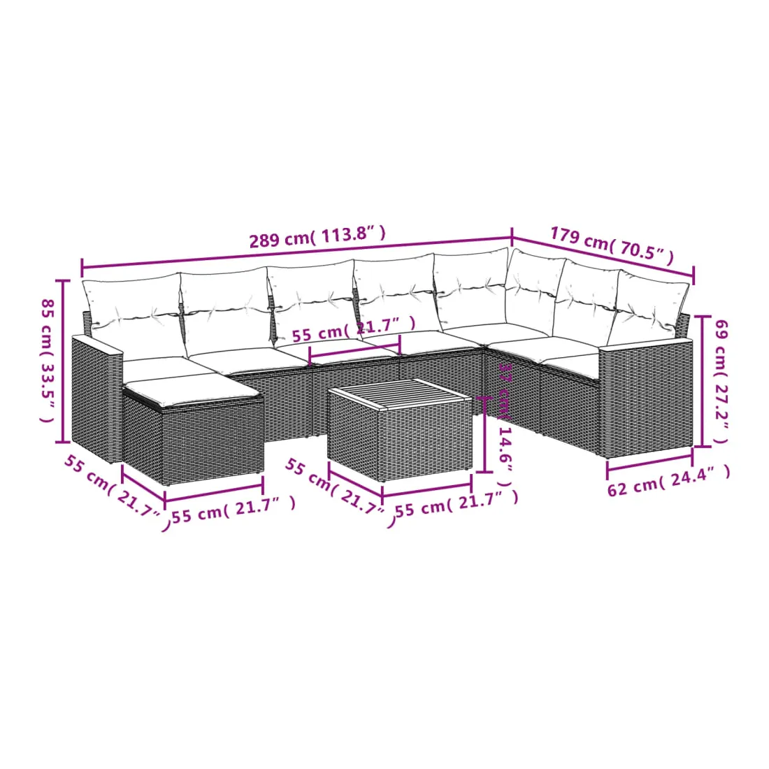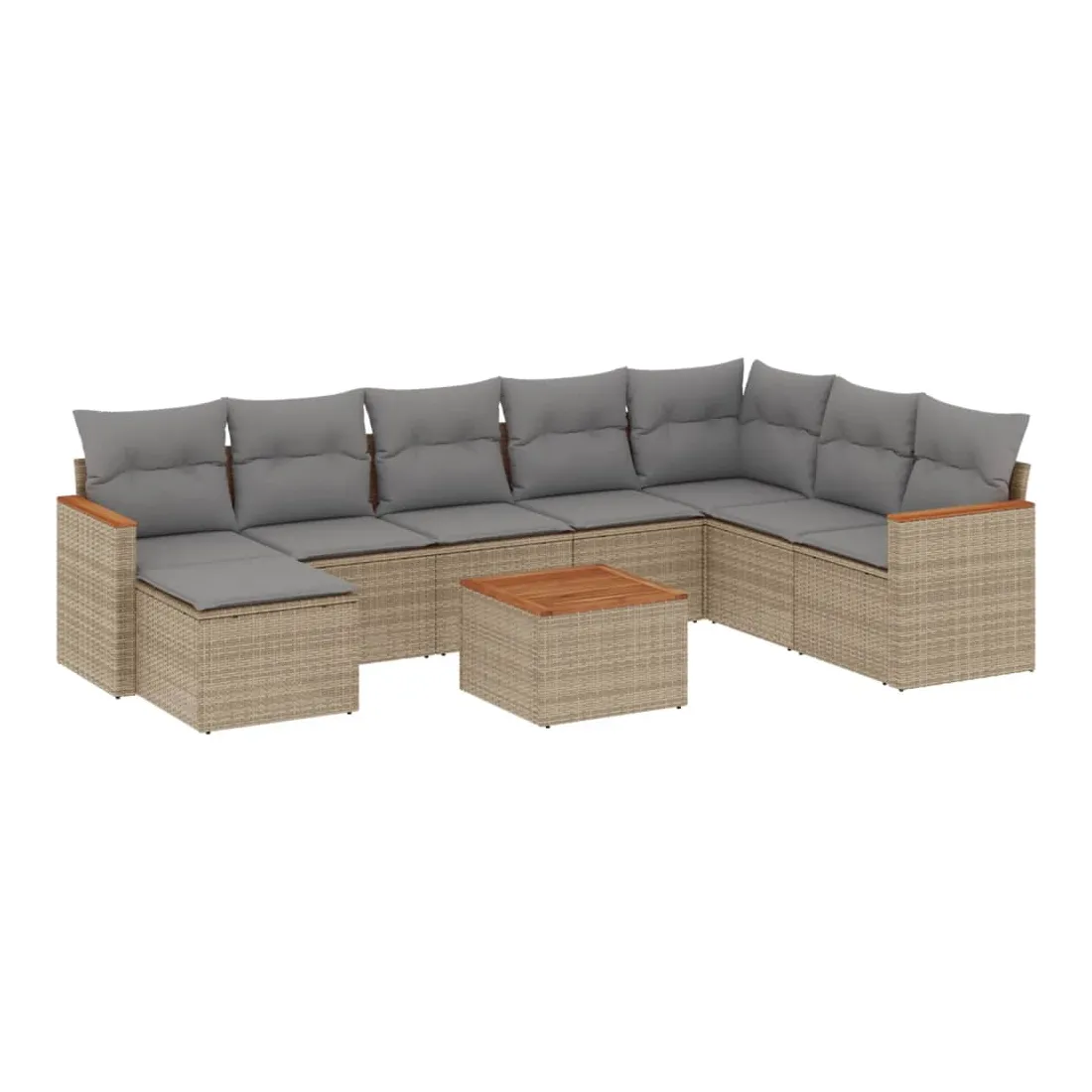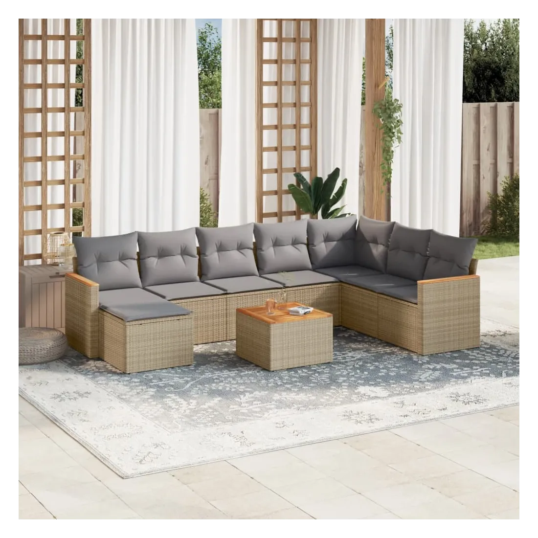 Cet ensemble de canapés de jardin est le complément parfait de votre arrière-cour, terrasse ou patio, offrant un espace confortable et accueillant pour discuter avec la famille et les amis ou simplement se détendre et profiter de l'extérieur. Matériau durable : la résine tressée, également connue sous le nom de poly rotin, est un matériau synthétique solide et nécessitant peu d'entretien qui ressemble au rotin naturel. Il est léger, facile à nettoyer et couramment utilisé pour les meubles d'extérieur en raison de sa durabilité et de ses propriétés de résistance aux intempéries.Fonction de rangement avec sac résistant à l'eau : le mobilier de jardin dispose d'un espace de rangement sous l'assise, complété par un sac résistant à l'eau pour ranger coussins, jouets et autres objets. Le sac intérieur peut être solidement fixé au mobilier d'extérieur grâce à des attaches auto-agrippantes pour plus de stabilité.Dessus stable et facile à nettoyer : cette table de jardin a un dessus en bois d'acacia robuste, durable et facile à nettoyer avec un chiffon humide.Housse amovible et lavable : ces coussins de siège sont dotés de housses amovibles pour un lavage et un entretien faciles.Conception modulaire : cet ensemble de meubles d'extérieur a une conception modulaire, ce qui le rend complètement flexible et facile à déplacer, afin que vous puissiez créer un agencement de meubles d'extérieur personnalisé. Bon à savoir :Pour que vos meubles d'extérieur restent beaux, nous vous recommandons de les protéger avec une housse imperméable.