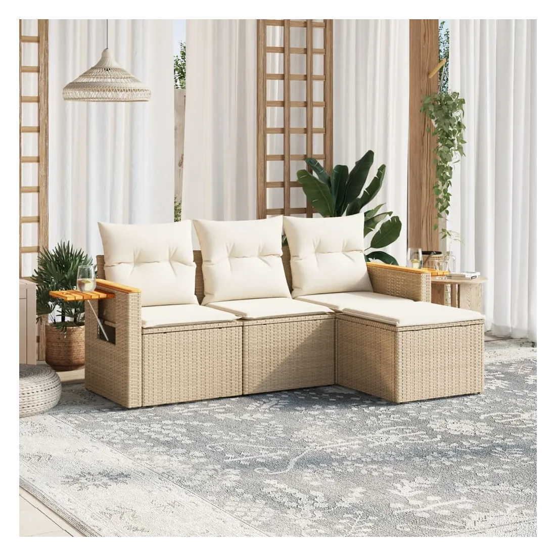 Cet ensemble de canapés de jardin est le complément parfait de votre arrière-cour, terrasse ou patio, offrant un espace confortable et accueillant pour discuter avec la famille et les amis ou simplement se détendre et profiter de l'extérieur. Matériau durable : la résine tressée, également connue sous le nom de poly rotin, est un matériau synthétique solide et nécessitant peu d'entretien qui ressemble au rotin naturel. Il est léger, facile à nettoyer et couramment utilisé pour les meubles d'extérieur en raison de sa durabilité et de ses propriétés de résistance aux intempéries.Fonction de rangement avec sac résistant à l'eau : le mobilier de jardin dispose d'un espace de rangement sous l'assise, complété par un sac résistant à l'eau pour ranger coussins, jouets et autres objets. Le sac intérieur peut être solidement fixé au mobilier d'extérieur grâce à des attaches auto-agrippantes pour plus de stabilité.Table d'appoint pratique : ce mobilier d'extérieur comprend une table d'appoint pliable avec un ressort à gaz sur les accoudoirs, offrant un endroit pratique pour garder vos essentiels à portée de main.Housse amovible et lavable : ces coussins de siège sont dotés de housses amovibles pour un lavage et un entretien faciles.Conception modulaire : cet ensemble de meubles d'extérieur a une conception modulaire, ce qui le rend complètement flexible et facile à déplacer, afin que vous puissiez créer un agencement de meubles d'extérieur personnalisé. Bon à savoir :Pour que vos meubles d'extérieur restent beaux, nous vous recommandons de les protéger avec une housse imperméable.