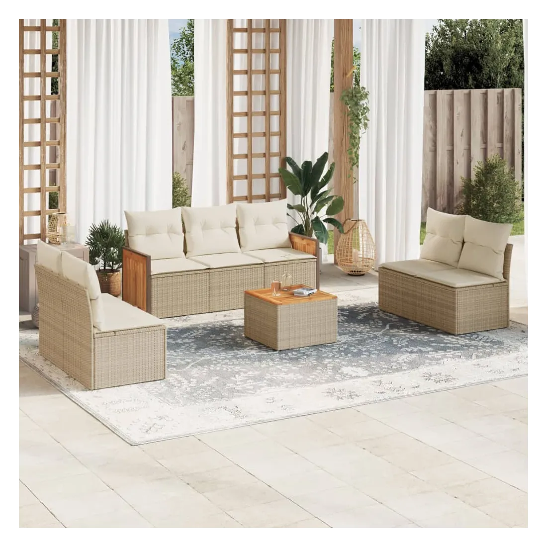 Cet ensemble de canapés de jardin est le complément parfait de votre arrière-cour, terrasse ou patio, offrant un espace confortable et accueillant pour discuter avec la famille et les amis ou simplement se détendre et profiter de l'extérieur. Matériau durable : la résine tressée, également connue sous le nom de poly rotin, est un matériau synthétique solide et nécessitant peu d'entretien qui ressemble au rotin naturel. Il est léger, facile à nettoyer et couramment utilisé pour les meubles d'extérieur en raison de sa durabilité et de ses propriétés de résistance aux intempéries.Fonction de rangement avec sac résistant à l'eau : le mobilier de jardin dispose d'un espace de rangement sous l'assise, complété par un sac résistant à l'eau pour ranger coussins, jouets et autres objets. Le sac intérieur peut être solidement fixé au mobilier d'extérieur grâce à des attaches auto-agrippantes pour plus de stabilité.Dessus stable et facile à nettoyer : cette table de jardin a un dessus en bois d'acacia robuste, durable et facile à nettoyer avec un chiffon humide.Housse amovible et lavable : ces coussins de siège sont dotés de housses amovibles pour un lavage et un entretien faciles.Conception modulaire : cet ensemble de meubles d'extérieur a une conception modulaire, ce qui le rend complètement flexible et facile à déplacer, afin que vous puissiez créer un agencement de meubles d'extérieur personnalisé. Bon à savoir :Pour que vos meubles d'extérieur restent beaux, nous vous recommandons de les protéger avec une housse imperméable.