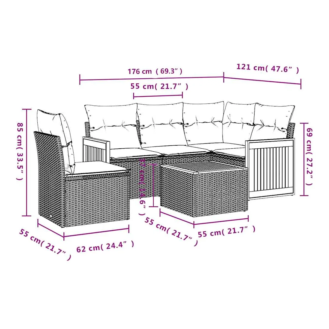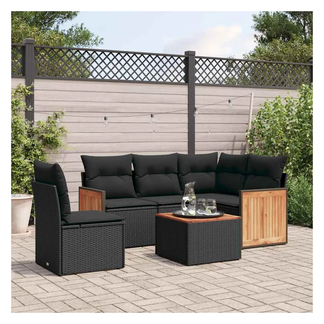 Cet ensemble de canapés de jardin est le complément parfait de votre arrière-cour, terrasse ou patio, offrant un espace confortable et accueillant pour discuter avec la famille et les amis ou simplement se détendre et profiter de l'extérieur. Matériau durable : la résine tressée, également connue sous le nom de poly rotin, est un matériau synthétique solide et nécessitant peu d'entretien qui ressemble au rotin naturel. Il est léger, facile à nettoyer et couramment utilisé pour les meubles d'extérieur en raison de sa durabilité et de ses propriétés de résistance aux intempéries.Fonction de rangement avec sac résistant à l'eau : le mobilier de jardin dispose d'un espace de rangement sous l'assise, complété par un sac résistant à l'eau pour ranger coussins, jouets et autres objets. Le sac intérieur peut être solidement fixé au mobilier d'extérieur grâce à des attaches auto-agrippantes pour plus de stabilité.Dessus stable et facile à nettoyer : cette table de jardin a un dessus en bois d'acacia robuste, durable et facile à nettoyer avec un chiffon humide.Housse amovible et lavable : ces coussins de siège sont dotés de housses amovibles pour un lavage et un entretien faciles.Conception modulaire : cet ensemble de meubles d'extérieur a une conception modulaire, ce qui le rend complètement flexible et facile à déplacer, afin que vous puissiez créer un agencement de meubles d'extérieur personnalisé. Bon à savoir :Pour que vos meubles d'extérieur restent beaux, nous vous recommandons de les protéger avec une housse imperméable.