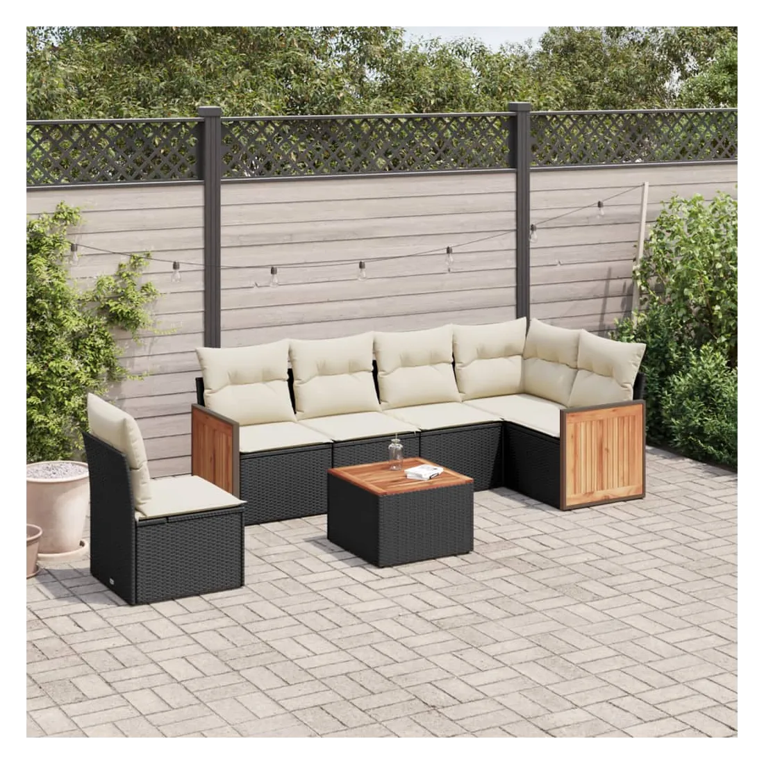Cet ensemble de canapés de jardin est le complément parfait de votre arrière-cour, terrasse ou patio, offrant un espace confortable et accueillant pour discuter avec la famille et les amis ou simplement se détendre et profiter de l'extérieur. Matériau durable : la résine tressée, également connue sous le nom de poly rotin, est un matériau synthétique solide et nécessitant peu d'entretien qui ressemble au rotin naturel. Il est léger, facile à nettoyer et couramment utilisé pour les meubles d'extérieur en raison de sa durabilité et de ses propriétés de résistance aux intempéries.Fonction de rangement avec sac résistant à l'eau : le mobilier de jardin dispose d'un espace de rangement sous l'assise, complété par un sac résistant à l'eau pour ranger coussins, jouets et autres objets. Le sac intérieur peut être solidement fixé au mobilier d'extérieur grâce à des attaches auto-agrippantes pour plus de stabilité.Dessus stable et facile à nettoyer : cette table de jardin a un dessus en bois d'acacia robuste, durable et facile à nettoyer avec un chiffon humide.Housse amovible et lavable : ces coussins de siège sont dotés de housses amovibles pour un lavage et un entretien faciles.Conception modulaire : cet ensemble de meubles d'extérieur a une conception modulaire, ce qui le rend complètement flexible et facile à déplacer, afin que vous puissiez créer un agencement de meubles d'extérieur personnalisé. Bon à savoir :Pour que vos meubles d'extérieur restent beaux, nous vous recommandons de les protéger avec une housse imperméable.