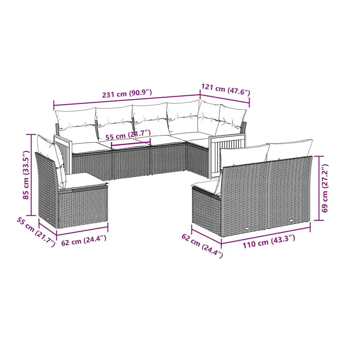 Cet ensemble de canapés de jardin est le complément parfait de votre arrière-cour, terrasse ou patio, offrant un espace confortable et accueillant pour discuter avec la famille et les amis ou simplement se détendre et profiter de l'extérieur. Matériau durable : la résine tressée, également connue sous le nom de poly rotin, est un matériau synthétique solide et nécessitant peu d'entretien qui ressemble au rotin naturel. Il est léger, facile à nettoyer et couramment utilisé pour les meubles d'extérieur en raison de sa durabilité et de ses propriétés de résistance aux intempéries.Fonction de rangement avec sac résistant à l'eau : le mobilier de jardin dispose d'un espace de rangement sous l'assise, complété par un sac résistant à l'eau pour ranger coussins, jouets et autres objets. Le sac intérieur peut être solidement fixé au mobilier d'extérieur grâce à des attaches auto-agrippantes pour plus de stabilité.Housse amovible et lavable : ces coussins de siège sont dotés de housses amovibles pour un lavage et un entretien faciles.Conception modulaire : cet ensemble de meubles d'extérieur a une conception modulaire, ce qui le rend complètement flexible et facile à déplacer, afin que vous puissiez créer un agencement de meubles d'extérieur personnalisé. Bon à savoir :Pour que vos meubles d'extérieur restent beaux, nous vous recommandons de les protéger avec une housse imperméable.