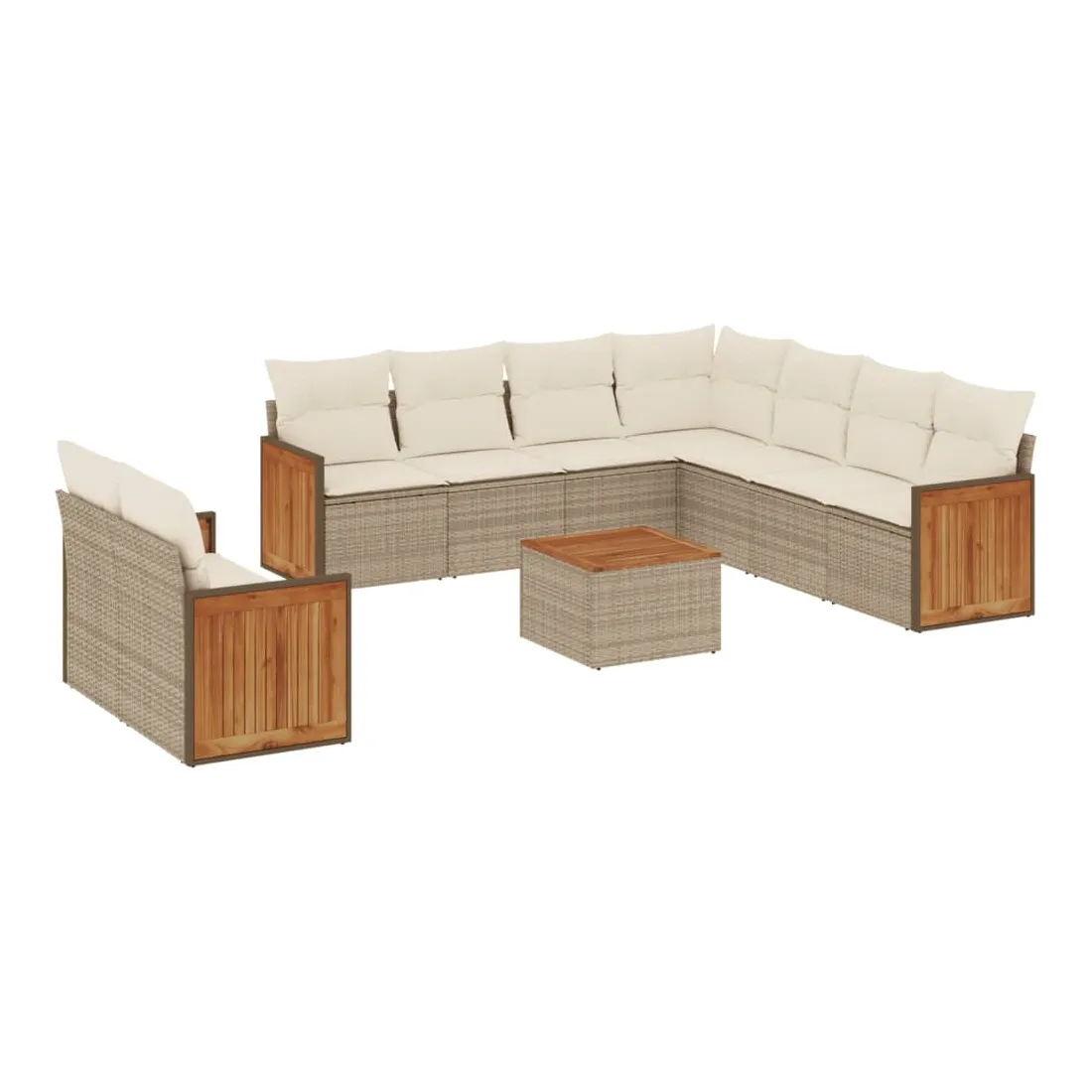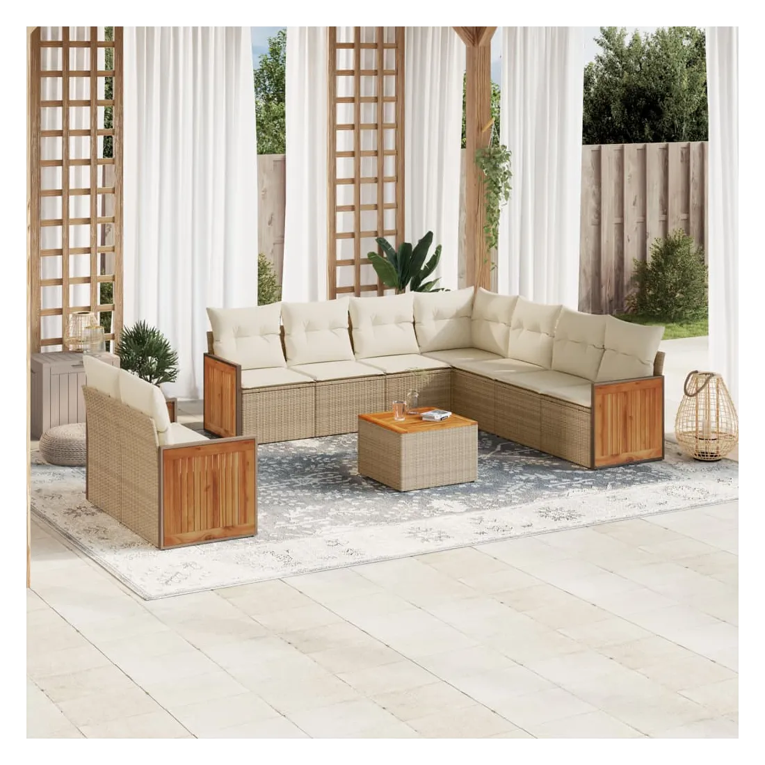 Cet ensemble de canapés de jardin est le complément parfait de votre arrière-cour, terrasse ou patio, offrant un espace confortable et accueillant pour discuter avec la famille et les amis ou simplement se détendre et profiter de l'extérieur. Matériau durable : la résine tressée, également connue sous le nom de poly rotin, est un matériau synthétique solide et nécessitant peu d'entretien qui ressemble au rotin naturel. Il est léger, facile à nettoyer et couramment utilisé pour les meubles d'extérieur en raison de sa durabilité et de ses propriétés de résistance aux intempéries.Fonction de rangement avec sac résistant à l'eau : le mobilier de jardin dispose d'un espace de rangement sous l'assise, complété par un sac résistant à l'eau pour ranger coussins, jouets et autres objets. Le sac intérieur peut être solidement fixé au mobilier d'extérieur grâce à des attaches auto-agrippantes pour plus de stabilité.Dessus stable et facile à nettoyer : cette table de jardin a un dessus en bois d'acacia robuste, durable et facile à nettoyer avec un chiffon humide.Housse amovible et lavable : ces coussins de siège sont dotés de housses amovibles pour un lavage et un entretien faciles.Conception modulaire : cet ensemble de meubles d'extérieur a une conception modulaire, ce qui le rend complètement flexible et facile à déplacer, afin que vous puissiez créer un agencement de meubles d'extérieur personnalisé. Bon à savoir :Pour que vos meubles d'extérieur restent beaux, nous vous recommandons de les protéger avec une housse imperméable.