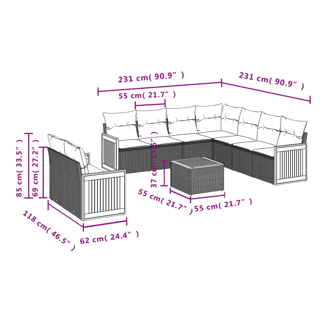 - 9 x coussin d'assise avec housse amovible et lavable