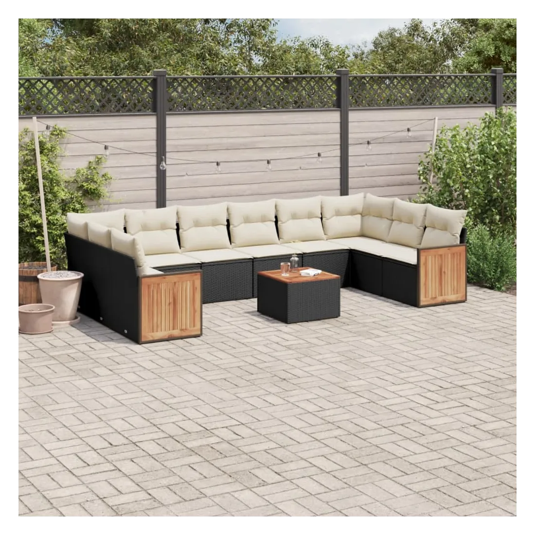 Cet ensemble de canapés de jardin est le complément parfait de votre arrière-cour, terrasse ou patio, offrant un espace confortable et accueillant pour discuter avec la famille et les amis ou simplement se détendre et profiter de l'extérieur. Matériau durable : la résine tressée, également connue sous le nom de poly rotin, est un matériau synthétique solide et nécessitant peu d'entretien qui ressemble au rotin naturel. Il est léger, facile à nettoyer et couramment utilisé pour les meubles d'extérieur en raison de sa durabilité et de ses propriétés de résistance aux intempéries.Fonction de rangement avec sac résistant à l'eau : le mobilier de jardin dispose d'un espace de rangement sous l'assise, complété par un sac résistant à l'eau pour ranger coussins, jouets et autres objets. Le sac intérieur peut être solidement fixé au mobilier d'extérieur grâce à des attaches auto-agrippantes pour plus de stabilité.Dessus stable et facile à nettoyer : cette table de jardin a un dessus en bois d'acacia robuste, durable et facile à nettoyer avec un chiffon humide.Housse amovible et lavable : ces coussins de siège sont dotés de housses amovibles pour un lavage et un entretien faciles.Conception modulaire : cet ensemble de meubles d'extérieur a une conception modulaire, ce qui le rend complètement flexible et facile à déplacer, afin que vous puissiez créer un agencement de meubles d'extérieur personnalisé. Bon à savoir :Pour que vos meubles d'extérieur restent beaux, nous vous recommandons de les protéger avec une housse imperméable.