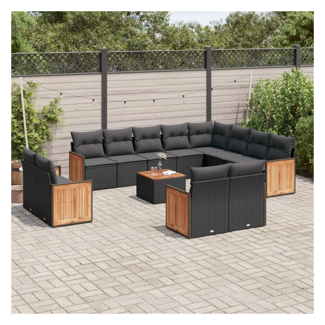 Cet ensemble de canapés de jardin est le complément parfait de votre arrière-cour, terrasse ou patio, offrant un espace confortable et accueillant pour discuter avec la famille et les amis ou simplement se détendre et profiter de l'extérieur. Matériau durable : la résine tressée, également connue sous le nom de poly rotin, est un matériau synthétique solide et nécessitant peu d'entretien qui ressemble au rotin naturel. Il est léger, facile à nettoyer et couramment utilisé pour les meubles d'extérieur en raison de sa durabilité et de ses propriétés de résistance aux intempéries.Fonction de rangement avec sac résistant à l'eau : le mobilier de jardin dispose d'un espace de rangement sous l'assise, complété par un sac résistant à l'eau pour ranger coussins, jouets et autres objets. Le sac intérieur peut être solidement fixé au mobilier d'extérieur grâce à des attaches auto-agrippantes pour plus de stabilité.Dessus stable et facile à nettoyer : cette table de jardin a un dessus en bois d'acacia robuste, durable et facile à nettoyer avec un chiffon humide.Housse amovible et lavable : ces coussins de siège sont dotés de housses amovibles pour un lavage et un entretien faciles.Conception modulaire : cet ensemble de meubles d'extérieur a une conception modulaire, ce qui le rend complètement flexible et facile à déplacer, afin que vous puissiez créer un agencement de meubles d'extérieur personnalisé. Bon à savoir :Pour que vos meubles d'extérieur restent beaux, nous vous recommandons de les protéger avec une housse imperméable.