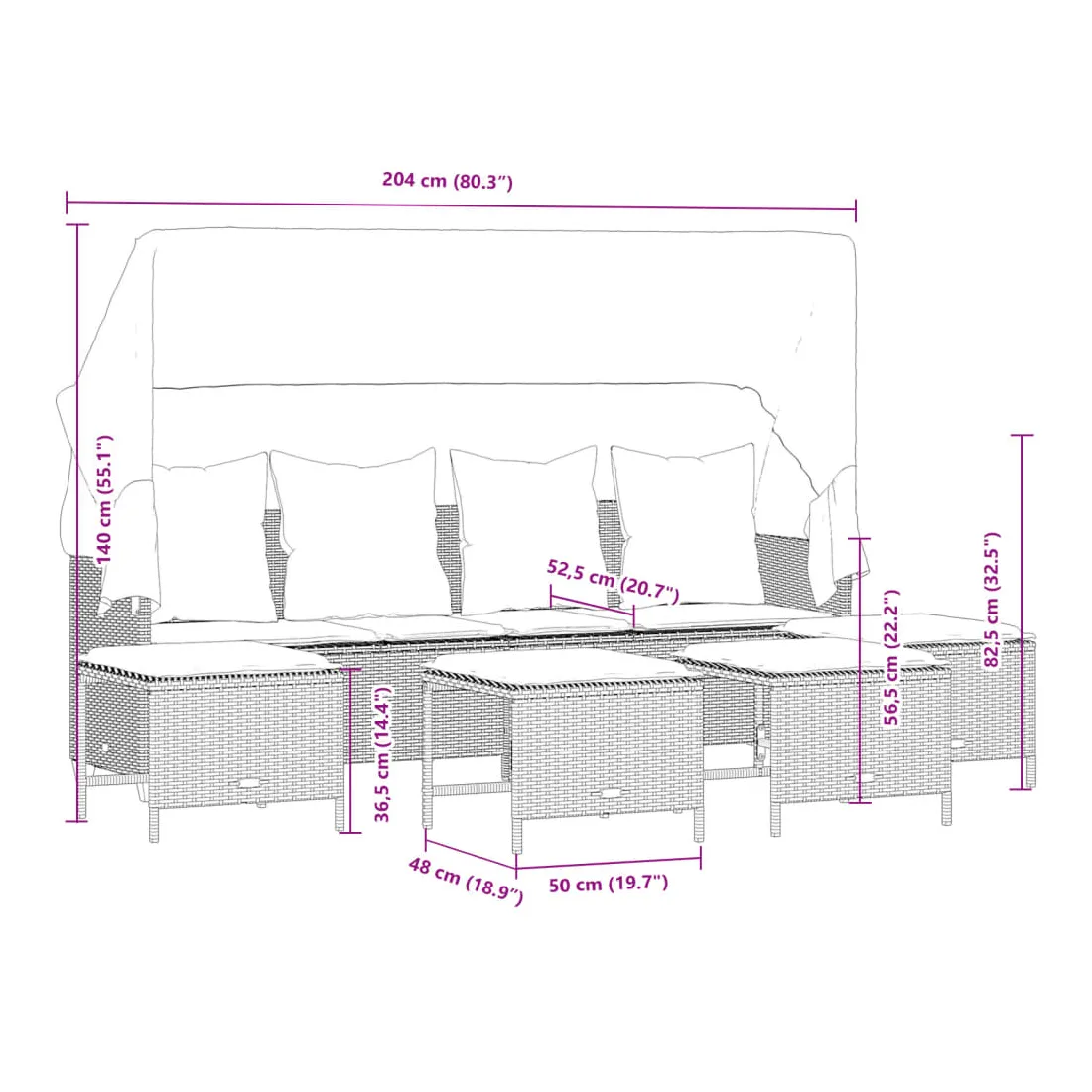 - Dimensions sans auvent : 204 x 55 x 69,5 cm (l x P x H)