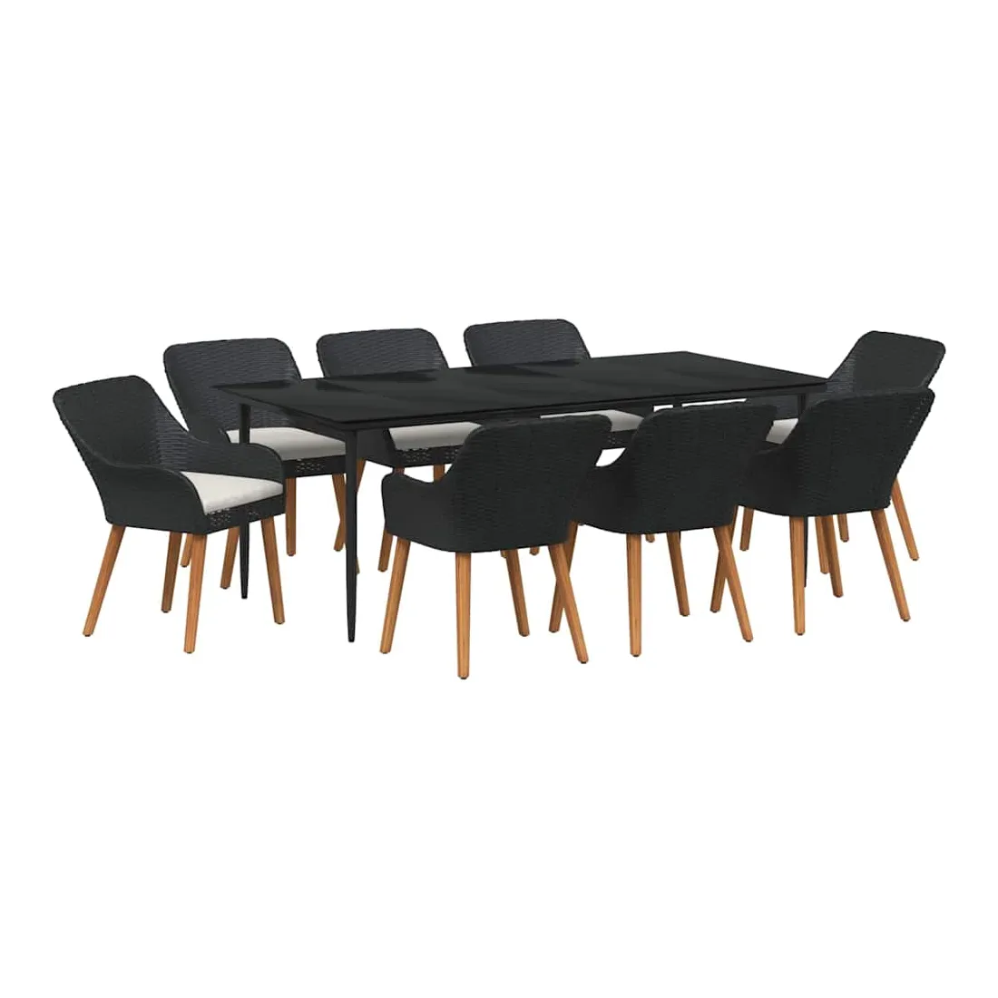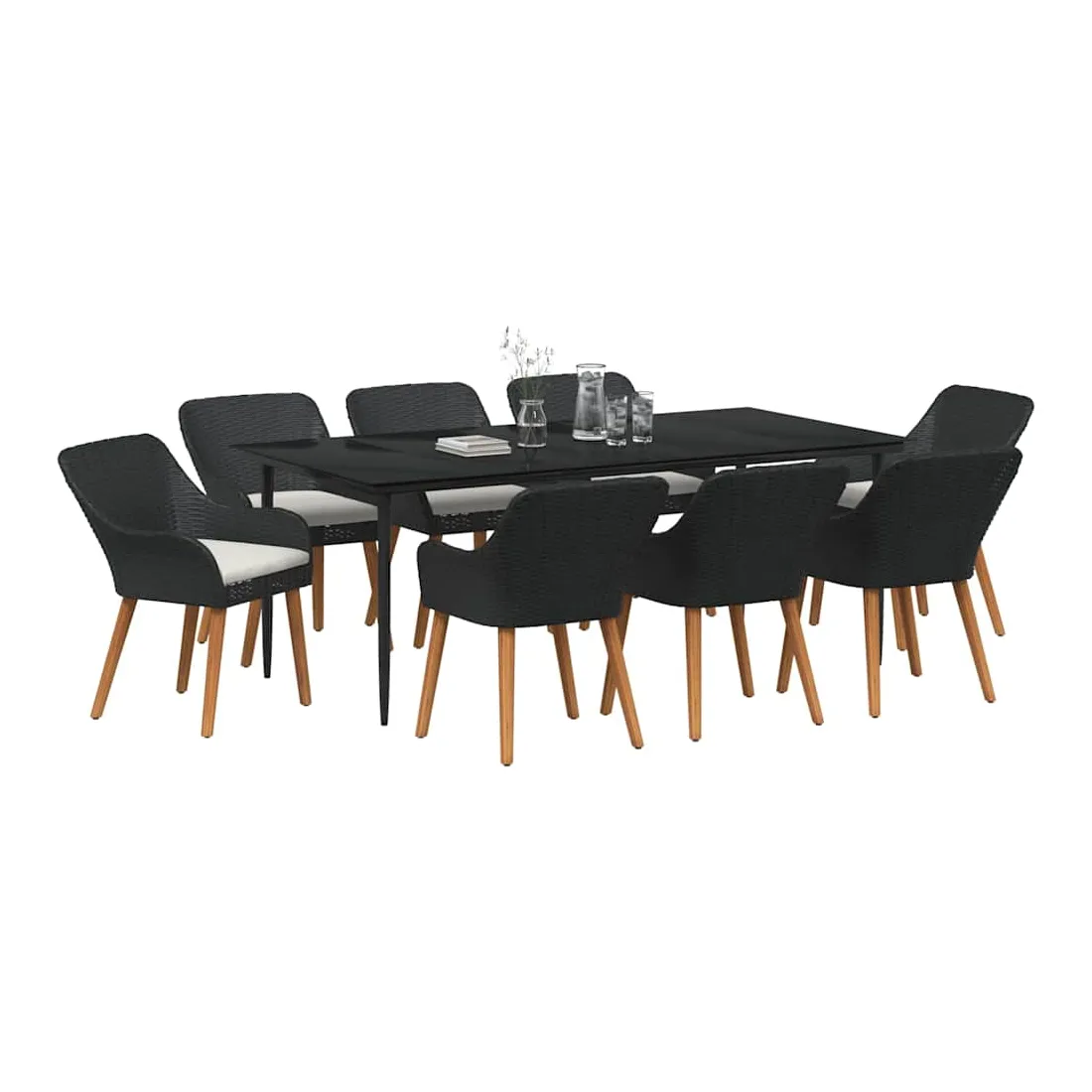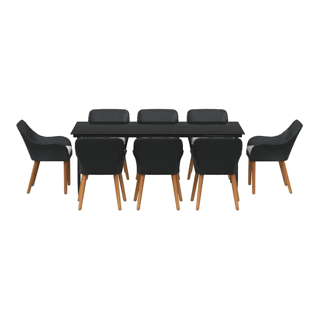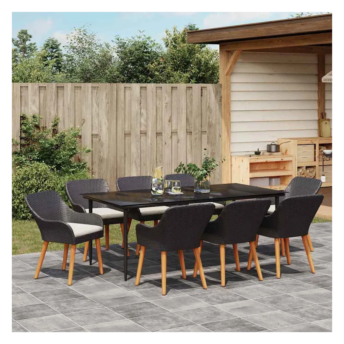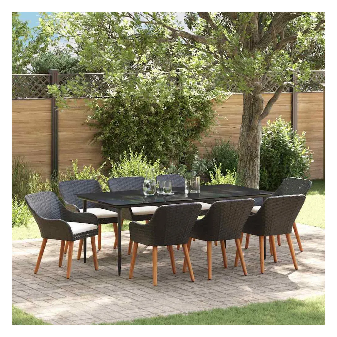 Le set de salle à manger de jardin est un super ajout à n'importe quel espace extérieur, avec un style moderne et des lignes épurées qui attirent l'œil. Réalisé pour ceux qui veulent le meilleur, cet ensemble allie perfection et style, idéal pour passer de bons moments dans votre jardin ou sur votre terrasse. Son look chic transforme votre extérieur en un endroit cool pour dîner et se relaxer. Matériau en poly rattan : Le set de salle à manger pour le jardin est fait en poly rattan, connu pour sa durabilité et son faible entretien. Ce matériau résiste aux intempéries, ce qui garantit que votre ensemble reste beau même après une utilisation extérieure. La texture du rattan apporte une touche classe à tout ensemble de jardin. Surface en verre trempé : La table est recouverte de verre trempé, ce qui offre une expérience de repas lisse. Le verre est facile à nettoyer, reste clair malgré le temps qu'il fait et ajoute une finition moderne qui complète bien le rattan. Confort total : Cet ensemble vient avec des coussins rembourrés conçus pour l'extérieur et résistants au mauvais temps, garantissant du confort même par temps difficile. Pensés pour le bien-être, les coussins s'adaptent bien aux chaises et visent à maximiser votre confort. Composants pratiques : La finition du dossier en poly rattan, avec des accoudoirs stables, crée une ambiance accueillante et ergonomique. Chaque élément a été soigneusement intégré pour rendre vos repas inoubliables. Entretien et maintenance : Conçu pour un entretien facile, il suffit de passer un coup de chiffon humide pour garder l'ensemble en top état. On vous conseille d'utiliser une housse étanche pour prolonger sa durabilité et garder son look au fil du temps.