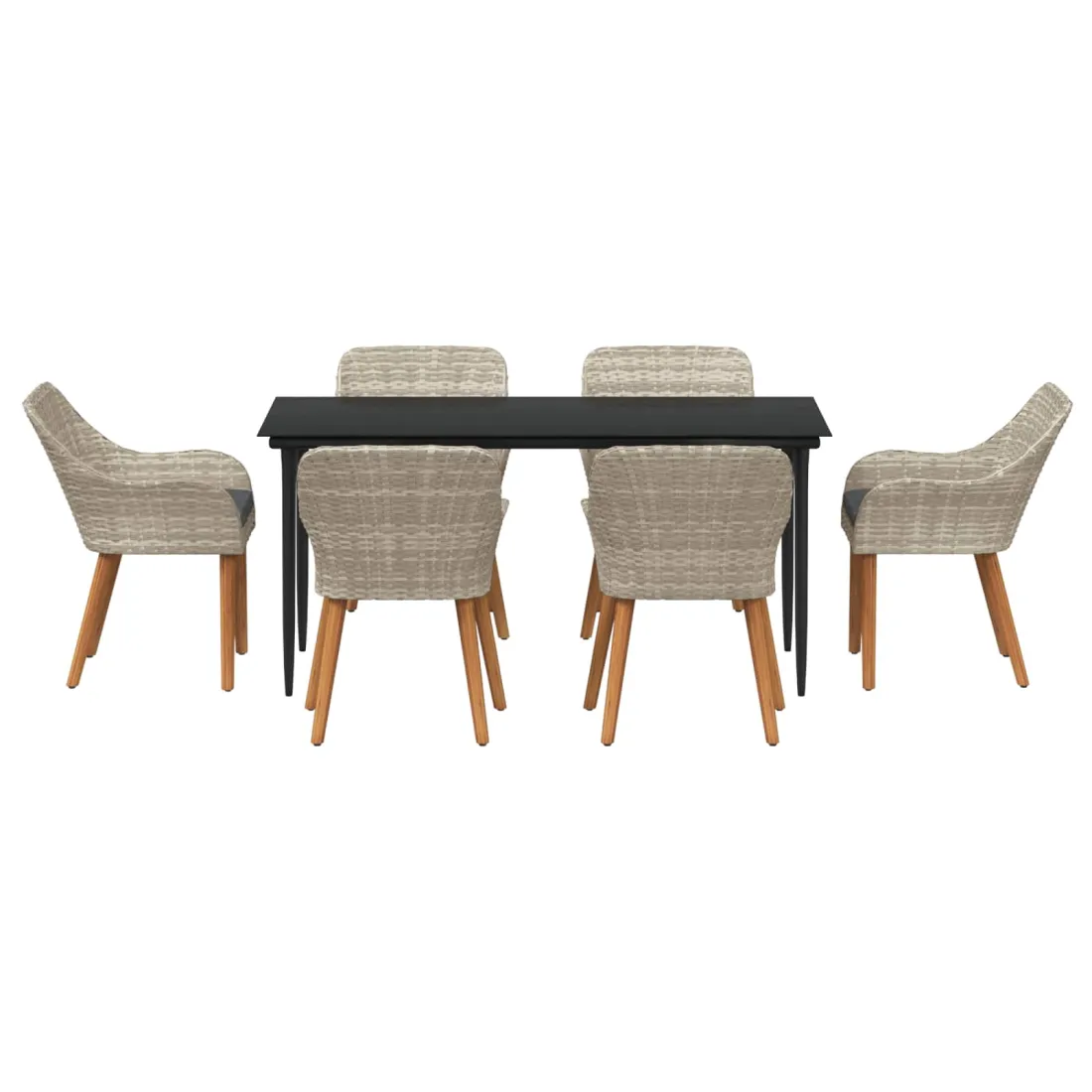 Cet ensemble de jardin moderne propose une solution à la fois actuelle et durable pour manger en extérieur, que ce soit dans le jardin ou sur la terrasse. Ses lignes épurées évoquent un design contemporain avec une large table et des chaises confortables, créant une ambiance conviviale pour vos repas en plein air. Sa finition en poly rattan gris clair s'harmonise parfaitement avec votre espace extérieur, alliant esthétique et fonctionnalité. Matériau qui tient dehors : Fabriqué avec un poly rattan résistant, cet ensemble est fait pour braver la météo, parfait pour le dehors toute l'année. Il résiste aux UV et à l'humidité, garantissant durabilité et entretien facile. Cadre en acier robuste : Fiable et solide, le cadre en acier revêtu de poudre donne une base stable, assurant sécurité durant les repas. Avec une qualité à l'esprit, il résiste bien et prolonge la vie de votre investissement. Coussins confortables : Ces coussins d'extérieur promise du confort sans compromettre leur résistance à la pluie et au soleil. Conçus pour des moments de détente, ils invitent vos invités à s'asseoir, discuter et manger tranquillement. Style moderne : Avec son look en poly rattan gris clair, cet ensemble s'intègre facilement dans tous les styles de décoration extérieure. Son design minimaliste rehausse l'ambiance sans trop charger l'espace, offrant une belle harmonie. Entretien facile : L'entretien est simple avec peu de besoin. Essuyez simplement les surfaces avec un chiffon sec pour que l'ensemble reste lumineux. Des housses de protection peuvent aussi être utilisées pour plus de soin lors de mauvais temps.
