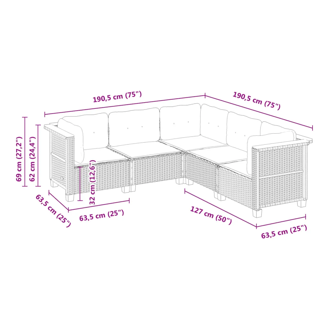 • Dimensions du coussin de dossier (angle) : 63,5 x 35 x 10 cm (L x l x é)