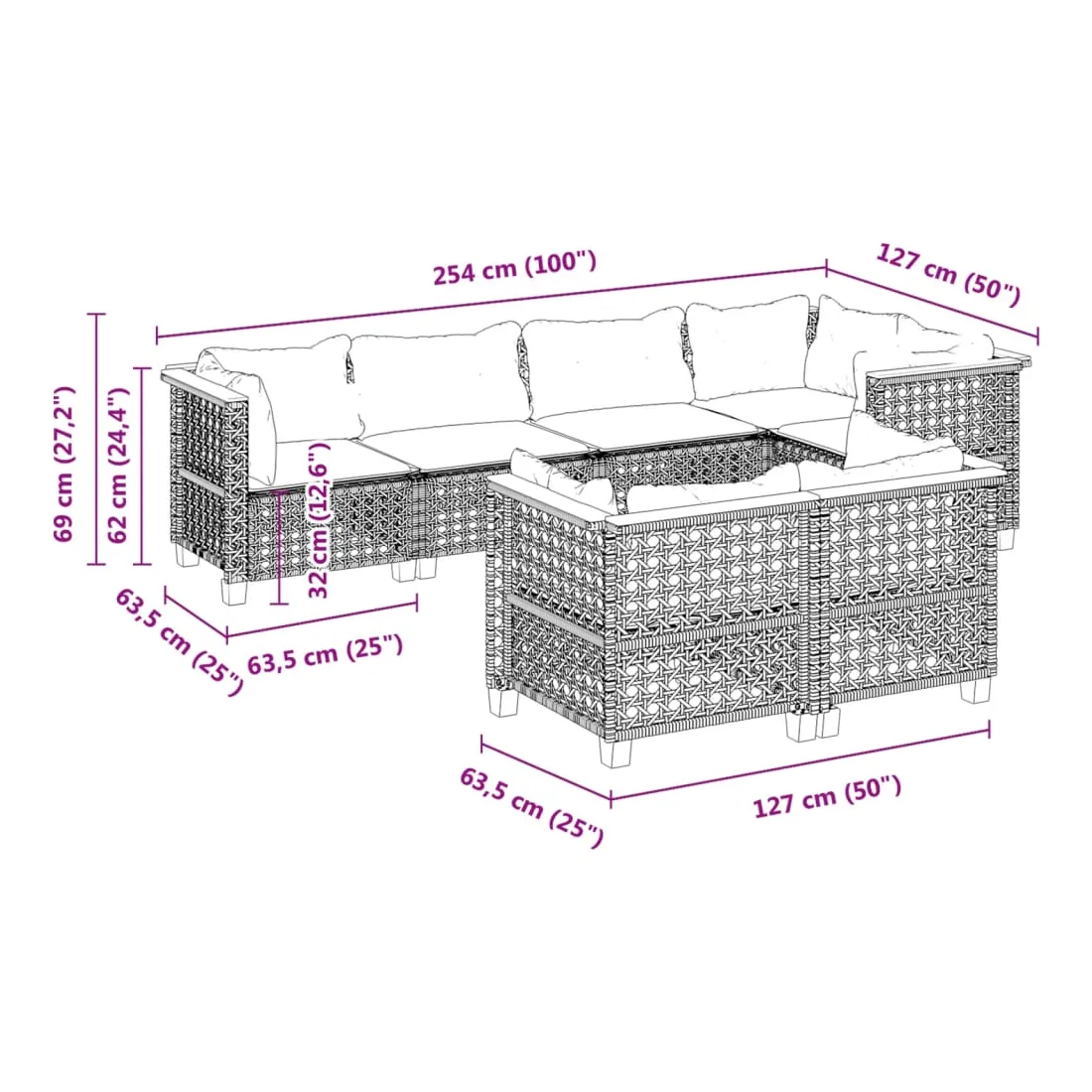 - Dimensions du coussin de dossier (angle) : 63,5 x 35 x 10 cm (L x l x é)