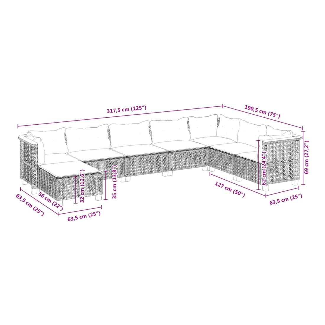 - Dimensions du coussin de dossier (angle) : 63,5 x 35 x 10 cm (L x l x é)