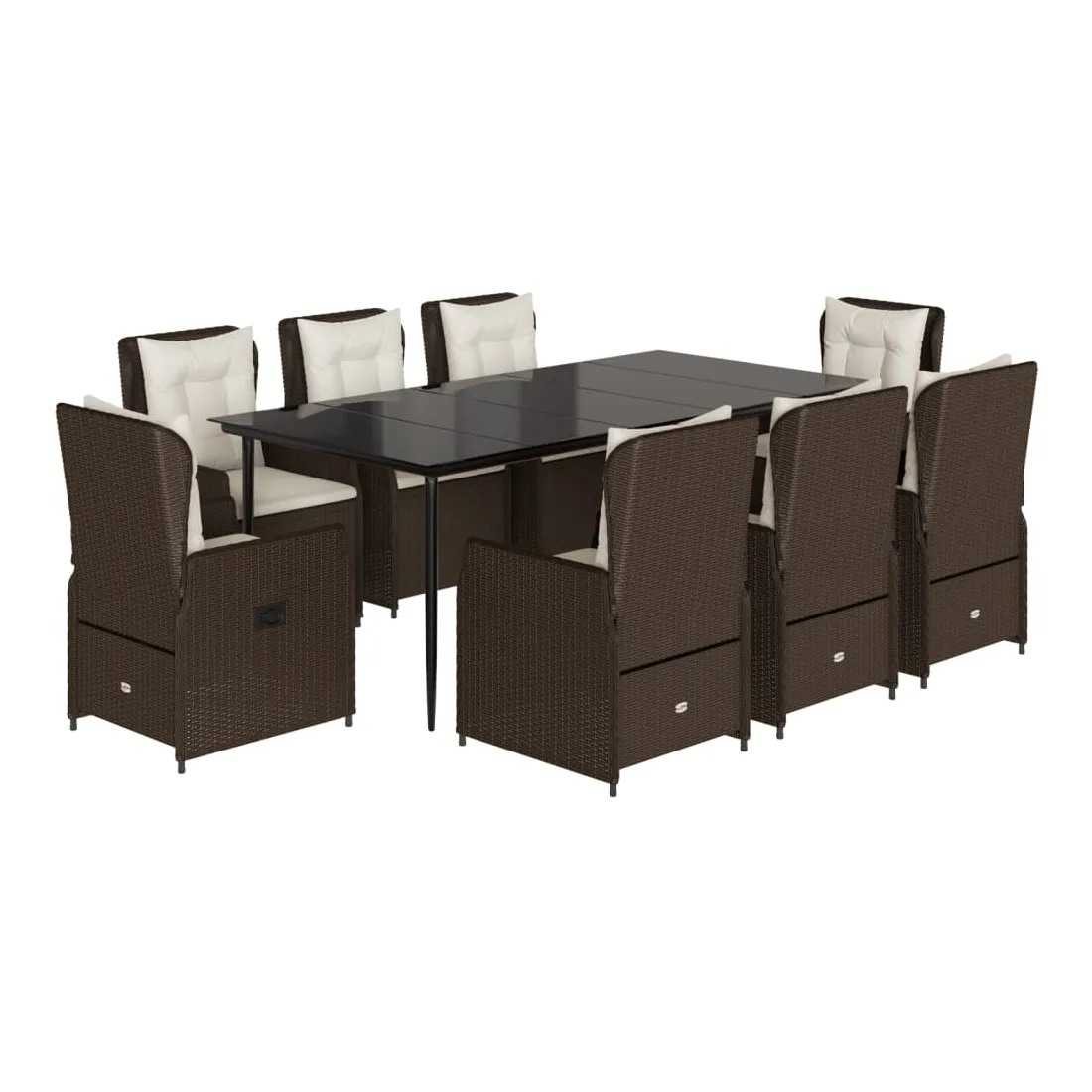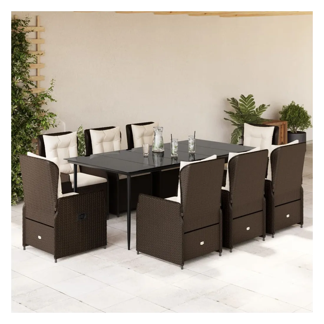 vidaXLCet ensemble de salle à manger de jardin est un excellent choix pour les repas en plein air ou pour vous détendre dans le jardin, dans l'arrière-cour ou sur la terrasse. Matériau durable : la résine tressée, également connue sous le nom de poly rotin, est un matériau synthétique solide et nécessitant peu d'entretien qui ressemble au rotin naturel. Il est léger, facile à nettoyer et couramment utilisé pour les meubles d'extérieur en raison de sa durabilité et de ses propriétés de résistance aux intempéries.Dossier réglable : ce siège de jardin est doté d'une poignée. Vous pouvez régler le dossier dans n'importe quelle position en tirant sur la poignée et le remettre rapidement dans sa position initiale.Expérience d'assise confortable : ce mobilier d'extérieur, doté de coussins épais, offre une expérience d'assise confortable.Housse amovible et lavable : le coussin de siège est doté d'une housse amovible pour un lavage et un entretien faciles.Dessus en verre : le dessus de la table d'extérieur est fabriqué en verre trempé solide et durable, ce qui le rend facile à nettoyer avec un chiffon humide et ajoute une touche d'élégance à votre espace extérieur. Bon à savoir :Pour que vos meubles d'extérieur restent beaux, nous vous recommandons de les protéger avec une housse imperméable.