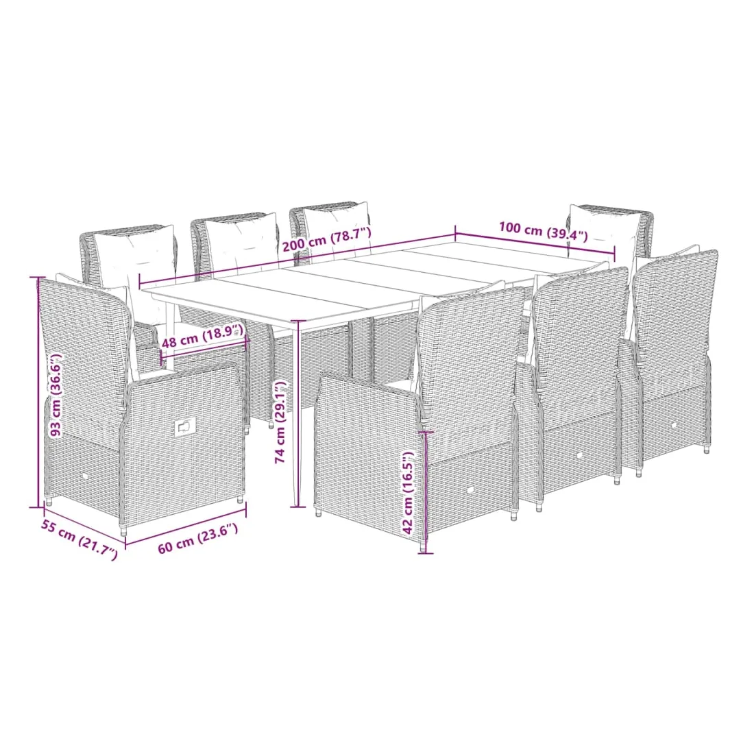 - Dimensions : 200 x 100 x 74 cm (L x l x H)