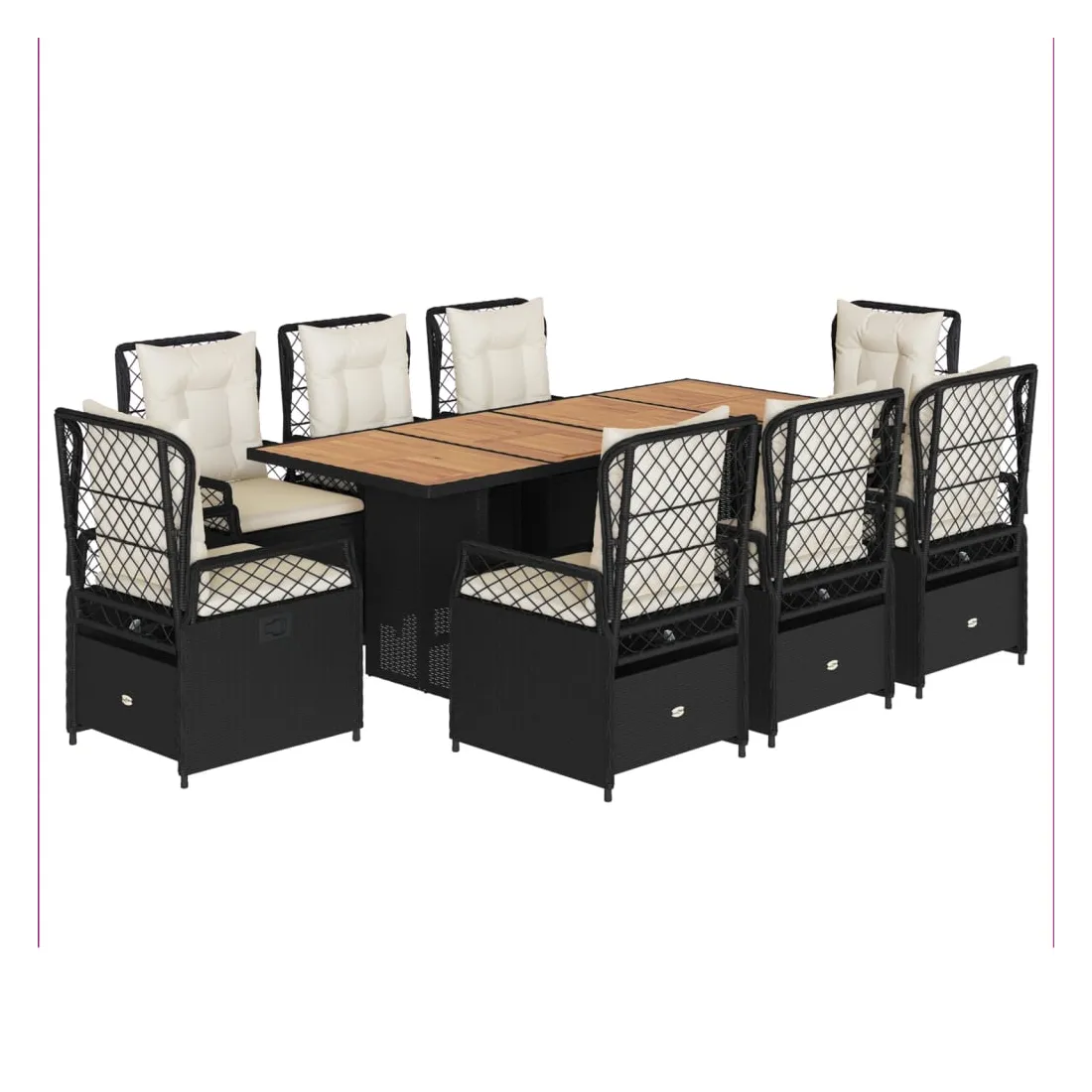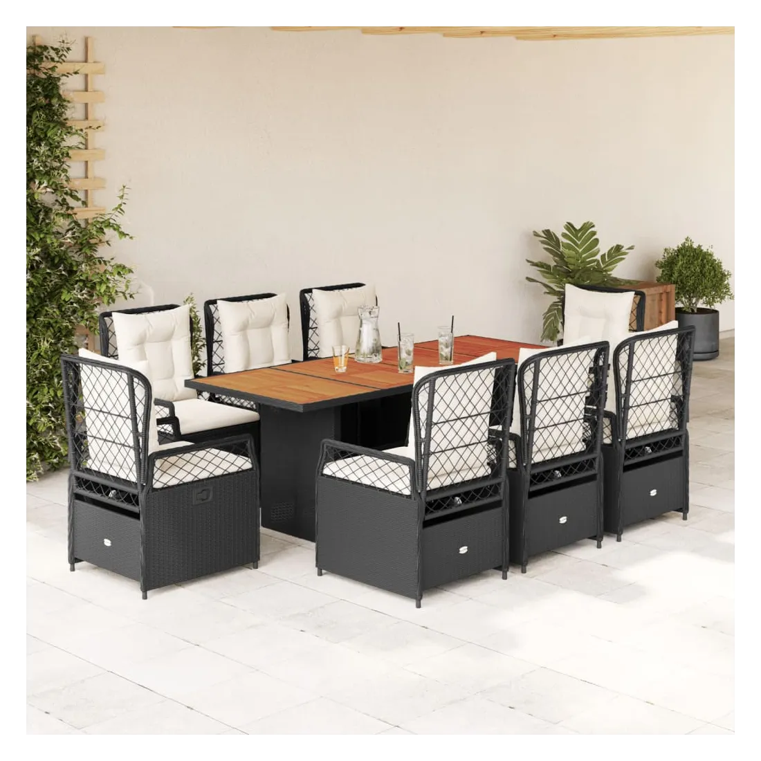Cet ensemble de salle à manger de jardin est un excellent choix pour les repas en plein air ou pour vous détendre dans le jardin, dans l'arrière-cour ou sur la terrasse. Matériau durable : la résine tressée, également connue sous le nom de poly rotin, est un matériau synthétique solide et nécessitant peu d'entretien qui ressemble au rotin naturel. Il est léger, facile à nettoyer et couramment utilisé pour les meubles d'extérieur en raison de sa durabilité et de ses propriétés de résistance aux intempéries.Dossier réglable : ce siège de jardin est doté d'une poignée. Vous pouvez régler le dossier dans n'importe quelle position en tirant sur la poignée et le remettre rapidement dans sa position initiale.Expérience d'assise confortable : ce mobilier d'extérieur, doté de coussins épais, offre une expérience d'assise confortable.Housse amovible et lavable : le coussin de siège est doté d'une housse amovible pour un lavage et un entretien faciles.Dessus stable et facile à nettoyer : cette table de jardin a un dessus en bois d'acacia robuste, durable et facile à nettoyer avec un chiffon humide. Bon à savoir :Pour que vos meubles d'extérieur restent beaux, nous vous recommandons de les protéger avec une housse imperméable.