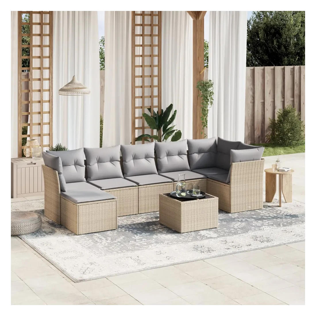 Cet ensemble de canapés de jardin est le complément parfait de votre arrière-cour, terrasse ou patio, offrant un espace confortable et accueillant pour discuter avec la famille et les amis ou simplement se détendre et profiter de l'extérieur. Matériau durable : la résine tressée, également connue sous le nom de poly rotin, est un matériau synthétique solide et nécessitant peu d'entretien qui ressemble au rotin naturel. Il est léger, facile à nettoyer et couramment utilisé pour les meubles d'extérieur en raison de sa durabilité et de ses propriétés de résistance aux intempéries.Dessus en verre : le dessus de la table d'extérieur est fabriqué en verre trempé solide et durable, ce qui le rend facile à nettoyer avec un chiffon humide et ajoute une touche d'élégance à votre espace extérieur.Housse amovible et lavable : ces coussins de siège sont dotés de housses amovibles pour un lavage et un entretien faciles.Cadre robuste et stable : le cadre en acier enduit de poudre assure la solidité et la stabilité du meuble de jardin pour une utilisation quotidienne à l'extérieur.Conception modulaire : cet ensemble de meubles d'extérieur a une conception modulaire, ce qui le rend complètement flexible et facile à déplacer, afin que vous puissiez créer un agencement de meubles d'extérieur personnalisé. Bon à savoir :Pour que vos meubles d'extérieur restent beaux, nous vous recommandons de les protéger avec une housse imperméable.