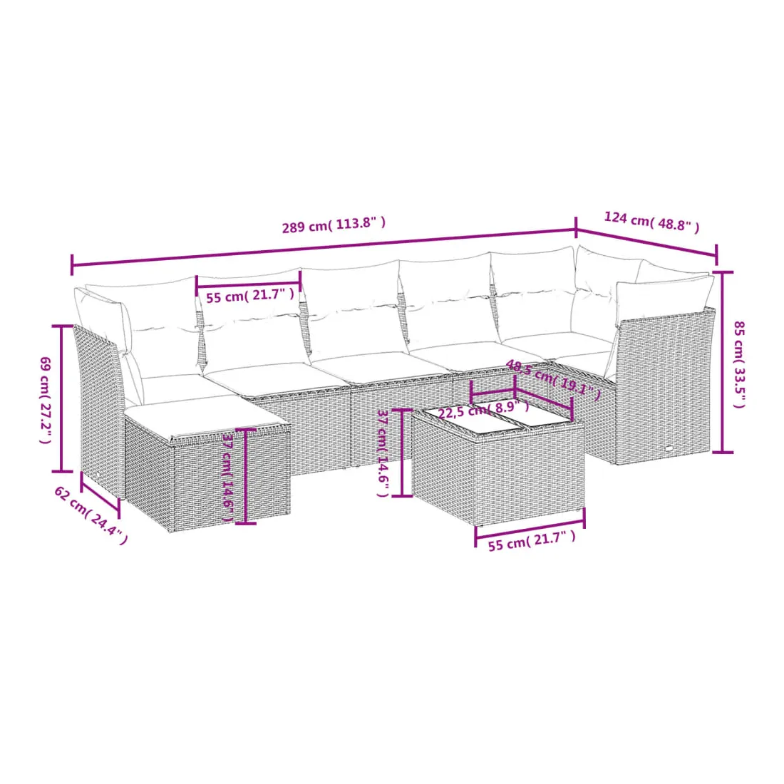 - 7 x coussin de siège avec housse amovible et lavable
