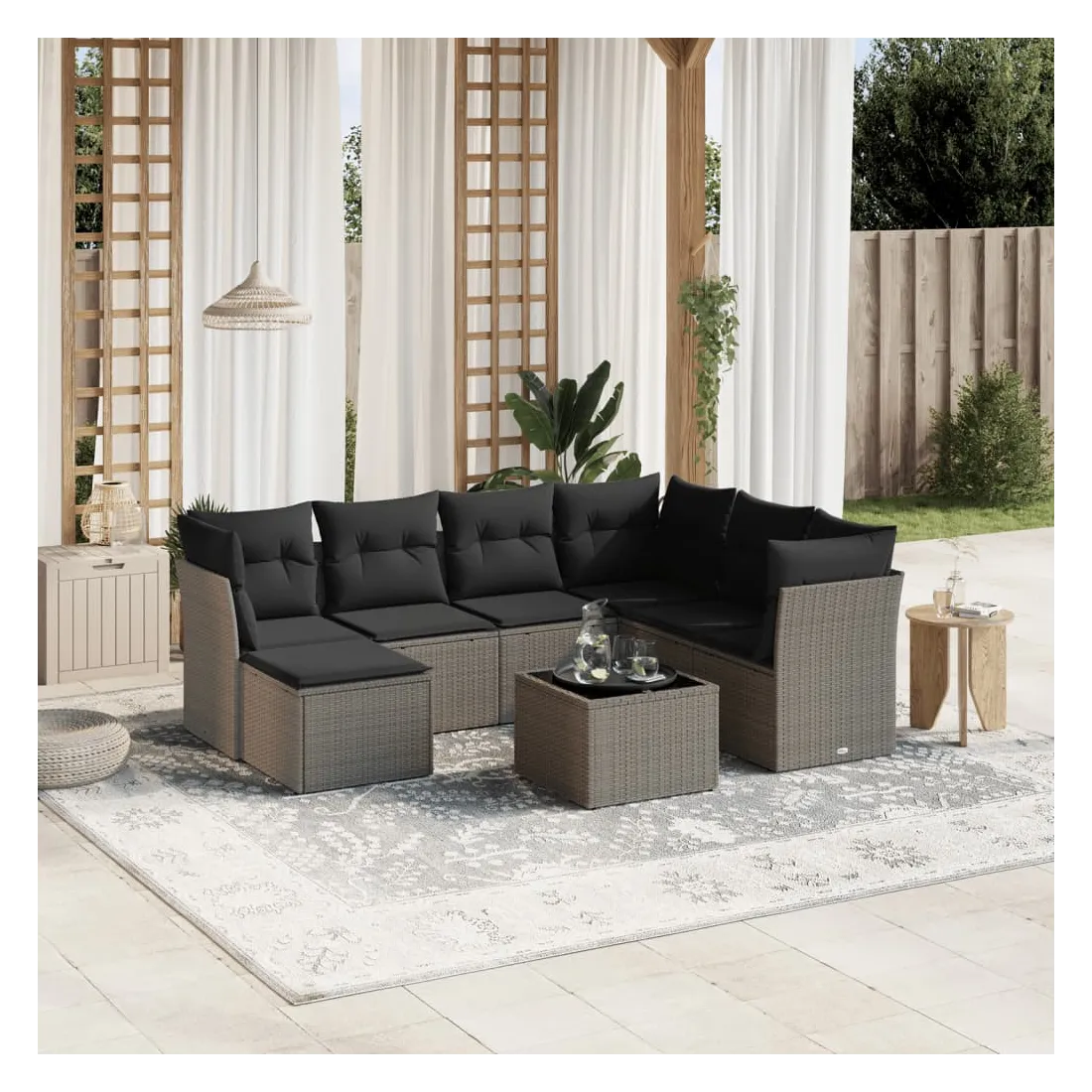 Cet ensemble de canapés de jardin est le complément parfait de votre arrière-cour, terrasse ou patio, offrant un espace confortable et accueillant pour discuter avec la famille et les amis ou simplement se détendre et profiter de l'extérieur. Matériau durable : la résine tressée, également connue sous le nom de poly rotin, est un matériau synthétique solide et nécessitant peu d'entretien qui ressemble au rotin naturel. Il est léger, facile à nettoyer et couramment utilisé pour les meubles d'extérieur en raison de sa durabilité et de ses propriétés de résistance aux intempéries.Dessus en verre : le dessus de la table d'extérieur est fabriqué en verre trempé solide et durable, ce qui le rend facile à nettoyer avec un chiffon humide et ajoute une touche d'élégance à votre espace extérieur.Housse amovible et lavable : ces coussins de siège sont dotés de housses amovibles pour un lavage et un entretien faciles.Cadre robuste et stable : le cadre en acier enduit de poudre assure la solidité et la stabilité du meuble de jardin pour une utilisation quotidienne à l'extérieur.Conception modulaire : cet ensemble de meubles d'extérieur a une conception modulaire, ce qui le rend complètement flexible et facile à déplacer, afin que vous puissiez créer un agencement de meubles d'extérieur personnalisé. Bon à savoir :Pour que vos meubles d'extérieur restent beaux, nous vous recommandons de les protéger avec une housse imperméable.