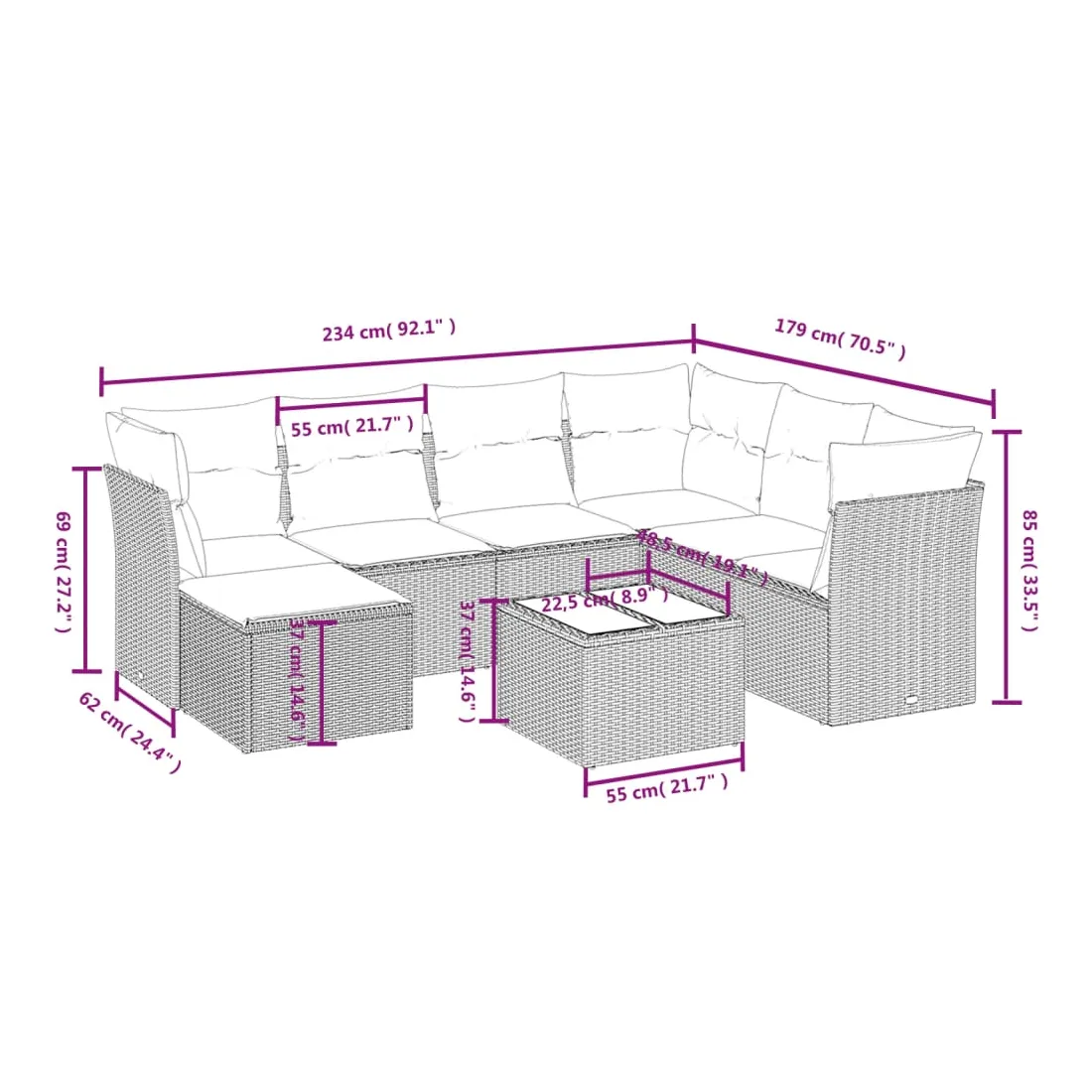 - 7 x coussin de siège avec housse amovible et lavable