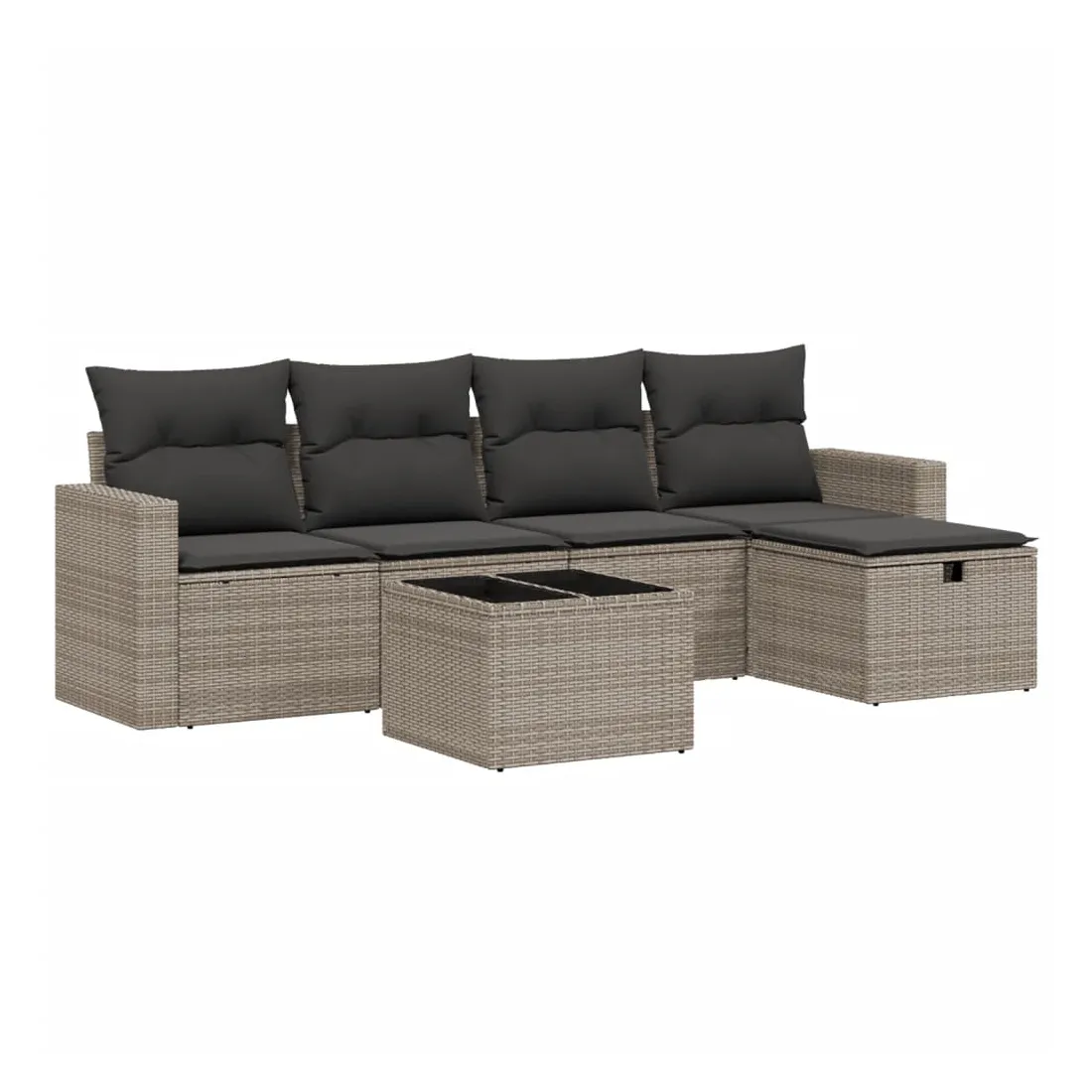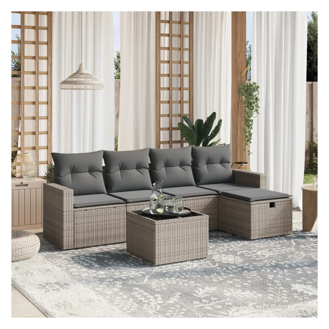 Cet ensemble de canapés de jardin est le complément parfait de votre arrière-cour, terrasse ou patio, offrant un espace confortable et accueillant pour discuter avec la famille et les amis ou simplement se détendre et profiter de l'extérieur. Matériau durable : la résine tressée, également connue sous le nom de poly rotin, est un matériau synthétique solide et nécessitant peu d'entretien qui ressemble au rotin naturel. Il est léger, facile à nettoyer et couramment utilisé pour les meubles d'extérieur en raison de sa durabilité et de ses propriétés de résistance aux intempéries.Dessus en verre : le dessus de la table d'extérieur est fabriqué en verre trempé solide et durable, ce qui le rend facile à nettoyer avec un chiffon humide et ajoute une touche d'élégance à votre espace extérieur.Housse amovible et lavable : ces coussins de siège sont dotés de housses amovibles pour un lavage et un entretien faciles.Cadre robuste et stable : le cadre en acier enduit de poudre assure la solidité et la stabilité du meuble de jardin pour une utilisation quotidienne à l'extérieur.Conception modulaire : cet ensemble de meubles d'extérieur a une conception modulaire, ce qui le rend complètement flexible et facile à déplacer, afin que vous puissiez créer un agencement de meubles d'extérieur personnalisé. Bon à savoir :Pour que vos meubles d'extérieur restent beaux, nous vous recommandons de les protéger avec une housse imperméable.