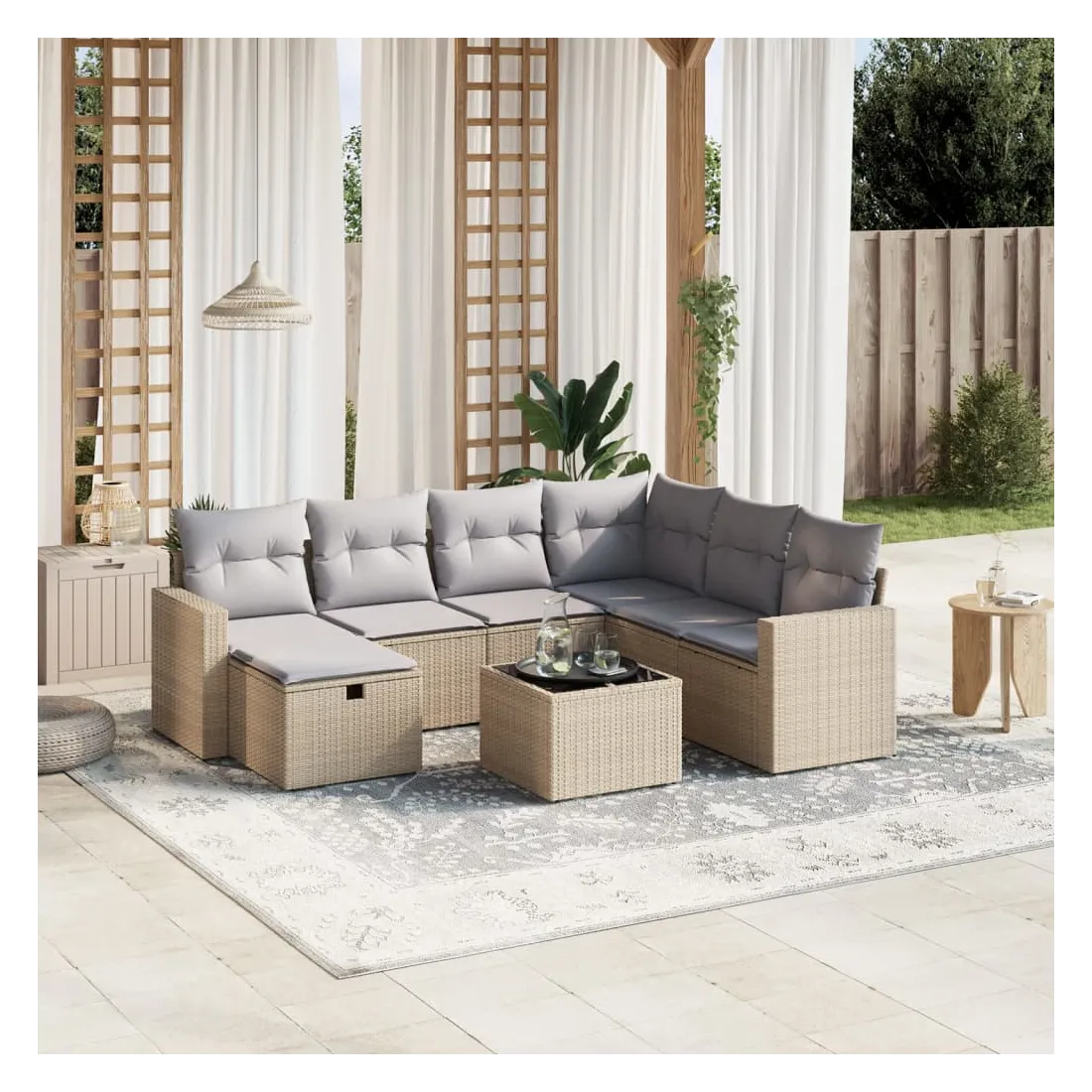 Cet ensemble de canapés de jardin est le complément parfait de votre arrière-cour, terrasse ou patio, offrant un espace confortable et accueillant pour discuter avec la famille et les amis ou simplement se détendre et profiter de l'extérieur. Matériau durable : la résine tressée, également connue sous le nom de poly rotin, est un matériau synthétique solide et nécessitant peu d'entretien qui ressemble au rotin naturel. Il est léger, facile à nettoyer et couramment utilisé pour les meubles d'extérieur en raison de sa durabilité et de ses propriétés de résistance aux intempéries.Dessus en verre : le dessus de la table d'extérieur est fabriqué en verre trempé solide et durable, ce qui le rend facile à nettoyer avec un chiffon humide et ajoute une touche d'élégance à votre espace extérieur.Housse amovible et lavable : ces coussins de siège sont dotés de housses amovibles pour un lavage et un entretien faciles.Cadre robuste et stable : le cadre en acier enduit de poudre assure la solidité et la stabilité du meuble de jardin pour une utilisation quotidienne à l'extérieur.Conception modulaire : cet ensemble de meubles d'extérieur a une conception modulaire, ce qui le rend complètement flexible et facile à déplacer, afin que vous puissiez créer un agencement de meubles d'extérieur personnalisé. Bon à savoir :Pour que vos meubles d'extérieur restent beaux, nous vous recommandons de les protéger avec une housse imperméable.