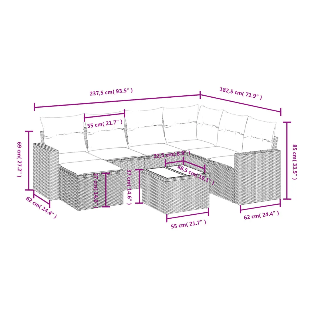 • 7 x coussin de siège avec housse amovible et lavable