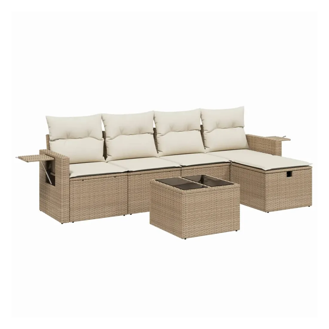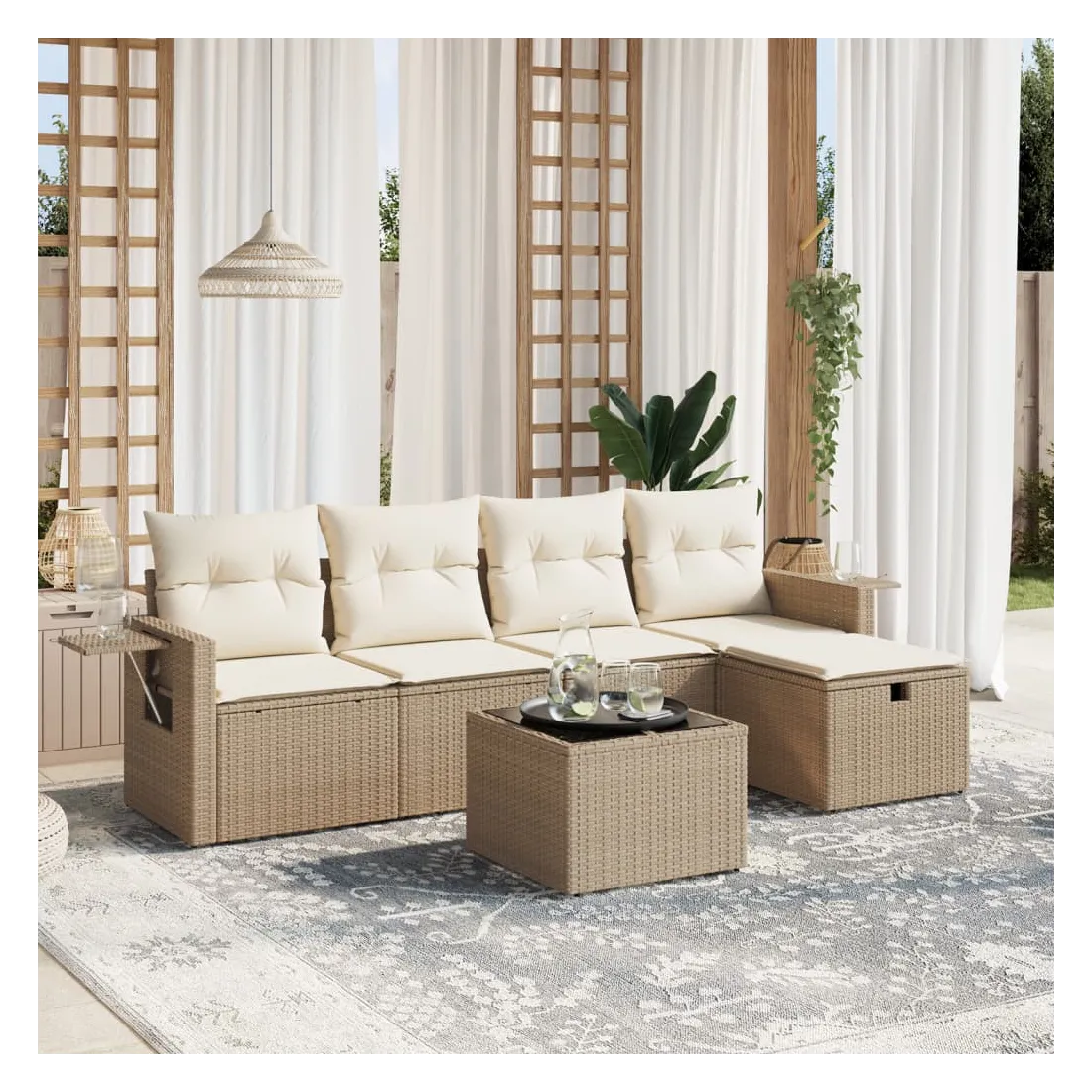 Cet ensemble de canapés de jardin est le complément parfait de votre arrière-cour, terrasse ou patio, offrant un espace confortable et accueillant pour discuter avec la famille et les amis ou simplement se détendre et profiter de l'extérieur. Matériau durable : la résine tressée, également connue sous le nom de poly rotin, est un matériau synthétique solide et nécessitant peu d'entretien qui ressemble au rotin naturel. Il est léger, facile à nettoyer et couramment utilisé pour les meubles d'extérieur en raison de sa durabilité et de ses propriétés de résistance aux intempéries.Dessus en verre : le dessus de la table d'extérieur est fabriqué en verre trempé solide et durable, ce qui le rend facile à nettoyer avec un chiffon humide et ajoute une touche d'élégance à votre espace extérieur.Housse amovible et lavable : ces coussins de siège sont dotés de housses amovibles pour un lavage et un entretien faciles.Cadre robuste et stable : le cadre en acier enduit de poudre assure la solidité et la stabilité du meuble de jardin pour une utilisation quotidienne à l'extérieur.Conception modulaire : cet ensemble de meubles d'extérieur a une conception modulaire, ce qui le rend complètement flexible et facile à déplacer, afin que vous puissiez créer un agencement de meubles d'extérieur personnalisé. Bon à savoir :Pour que vos meubles d'extérieur restent beaux, nous vous recommandons de les protéger avec une housse imperméable.