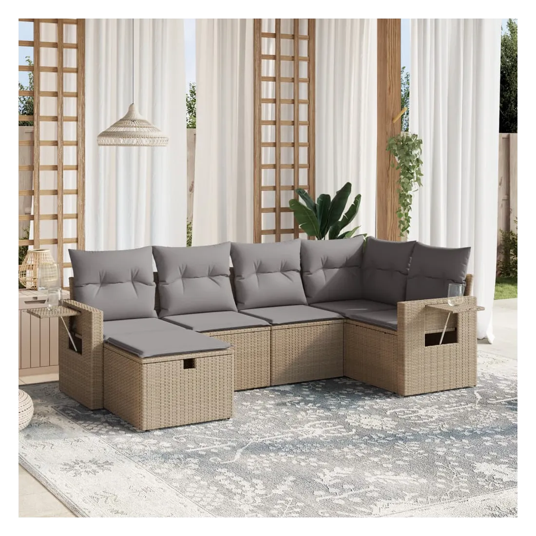 Cet ensemble de canapés de jardin est le complément parfait de votre arrière-cour, terrasse ou patio, offrant un espace confortable et accueillant pour discuter avec la famille et les amis ou simplement se détendre et profiter de l'extérieur. Matériau durable : la résine tressée, également connue sous le nom de poly rotin, est un matériau synthétique solide et nécessitant peu d'entretien qui ressemble au rotin naturel. Il est léger, facile à nettoyer et couramment utilisé pour les meubles d'extérieur en raison de sa durabilité et de ses propriétés de résistance aux intempéries.Expérience d'assise confortable : ce mobilier d'extérieur, doté de coussins épais, offre une expérience d'assise confortable.Housse amovible et lavable : ces coussins de siège sont dotés de housses amovibles pour un lavage et un entretien faciles.Cadre robuste et stable : le cadre en acier enduit de poudre assure la solidité et la stabilité du meuble de jardin pour une utilisation quotidienne à l'extérieur.Conception modulaire : cet ensemble de meubles d'extérieur a une conception modulaire, ce qui le rend complètement flexible et facile à déplacer, afin que vous puissiez créer un agencement de meubles d'extérieur personnalisé. Bon à savoir :Pour que vos meubles d'extérieur restent beaux, nous vous recommandons de les protéger avec une housse imperméable.