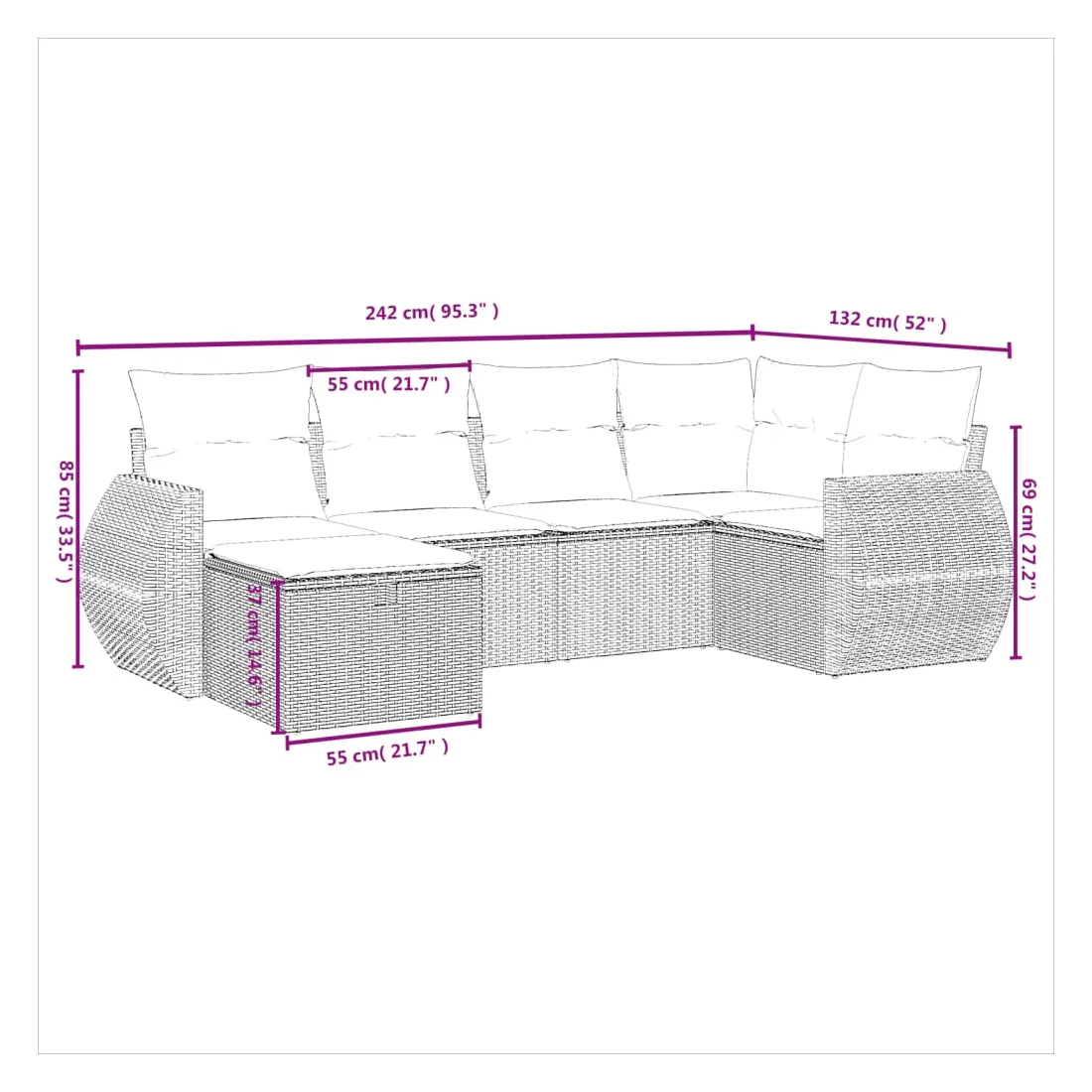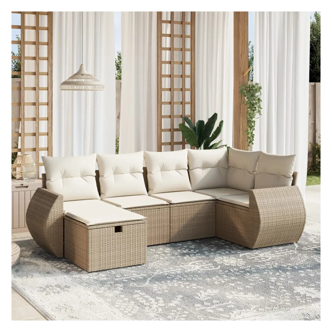 Cet ensemble de canapés de jardin est le complément parfait de votre arrière-cour, terrasse ou patio, offrant un espace confortable et accueillant pour discuter avec la famille et les amis ou simplement se détendre et profiter de l'extérieur. Matériau durable : la résine tressée, également connue sous le nom de poly rotin, est un matériau synthétique solide et nécessitant peu d'entretien qui ressemble au rotin naturel. Il est léger, facile à nettoyer et couramment utilisé pour les meubles d'extérieur en raison de sa durabilité et de ses propriétés de résistance aux intempéries.Expérience d'assise confortable : ce mobilier d'extérieur, doté de coussins épais, offre une expérience d'assise confortable.Housse amovible et lavable : ces coussins de siège sont dotés de housses amovibles pour un lavage et un entretien faciles.Cadre robuste et stable : le cadre en acier enduit de poudre assure la solidité et la stabilité du meuble de jardin pour une utilisation quotidienne à l'extérieur.Conception modulaire : cet ensemble de meubles d'extérieur a une conception modulaire, ce qui le rend complètement flexible et facile à déplacer, afin que vous puissiez créer un agencement de meubles d'extérieur personnalisé. Bon à savoir :Pour que vos meubles d'extérieur restent beaux, nous vous recommandons de les protéger avec une housse imperméable.