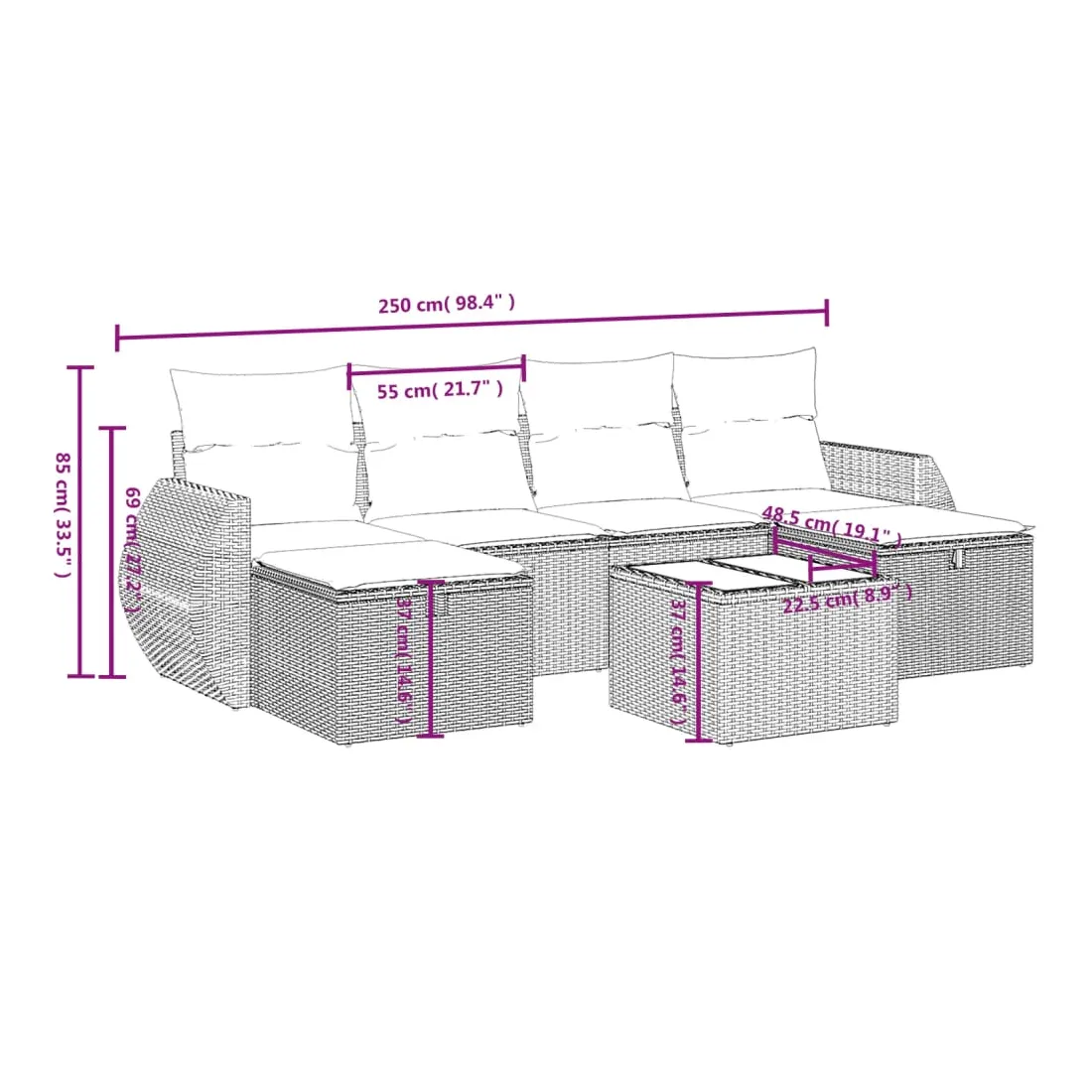 Cet ensemble de canapés de jardin est le complément parfait de votre arrière-cour, terrasse ou patio, offrant un espace confortable et accueillant pour discuter avec la famille et les amis ou simplement se détendre et profiter de l'extérieur. Matériau durable : la résine tressée, également connue sous le nom de poly rotin, est un matériau synthétique solide et nécessitant peu d'entretien qui ressemble au rotin naturel. Il est léger, facile à nettoyer et couramment utilisé pour les meubles d'extérieur en raison de sa durabilité et de ses propriétés de résistance aux intempéries.Expérience d'assise confortable : ce mobilier d'extérieur, doté de coussins épais, offre une expérience d'assise confortable.Housse amovible et lavable : ces coussins de siège sont dotés de housses amovibles pour un lavage et un entretien faciles.Cadre robuste et stable : le cadre en acier enduit de poudre assure la solidité et la stabilité du meuble de jardin pour une utilisation quotidienne à l'extérieur.Conception modulaire : cet ensemble de meubles d'extérieur a une conception modulaire, ce qui le rend complètement flexible et facile à déplacer, afin que vous puissiez créer un agencement de meubles d'extérieur personnalisé. Bon à savoir :Pour que vos meubles d'extérieur restent beaux, nous vous recommandons de les protéger avec une housse imperméable.