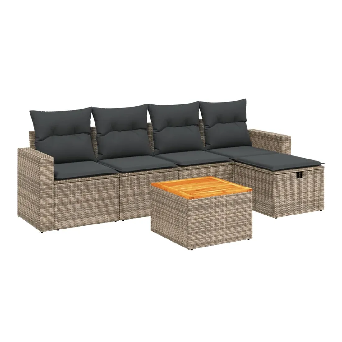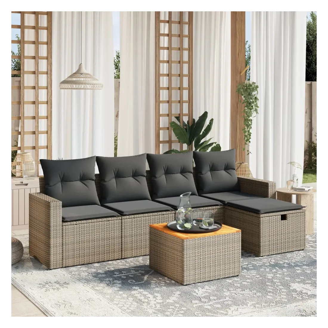 Cet ensemble de canapés de jardin est le complément parfait de votre arrière-cour, terrasse ou patio, offrant un espace confortable et accueillant pour discuter avec la famille et les amis ou simplement se détendre et profiter de l'extérieur. Matériau durable : la résine tressée, également connue sous le nom de poly rotin, est un matériau synthétique solide et nécessitant peu d'entretien qui ressemble au rotin naturel. Il est léger, facile à nettoyer et couramment utilisé pour les meubles d'extérieur en raison de sa durabilité et de ses propriétés de résistance aux intempéries.Dessus stable et facile à nettoyer : cette table de jardin a un dessus en bois d'acacia robuste, durable et facile à nettoyer avec un chiffon humide.Housse amovible et lavable : ces coussins de siège sont dotés de housses amovibles pour un lavage et un entretien faciles.Cadre robuste et stable : le cadre en acier enduit de poudre assure la solidité et la stabilité du meuble de jardin pour une utilisation quotidienne à l'extérieur.Conception modulaire : cet ensemble de meubles d'extérieur a une conception modulaire, ce qui le rend complètement flexible et facile à déplacer, afin que vous puissiez créer un agencement de meubles d'extérieur personnalisé. Bon à savoir :Pour que vos meubles d'extérieur restent beaux, nous vous recommandons de les protéger avec une housse imperméable.