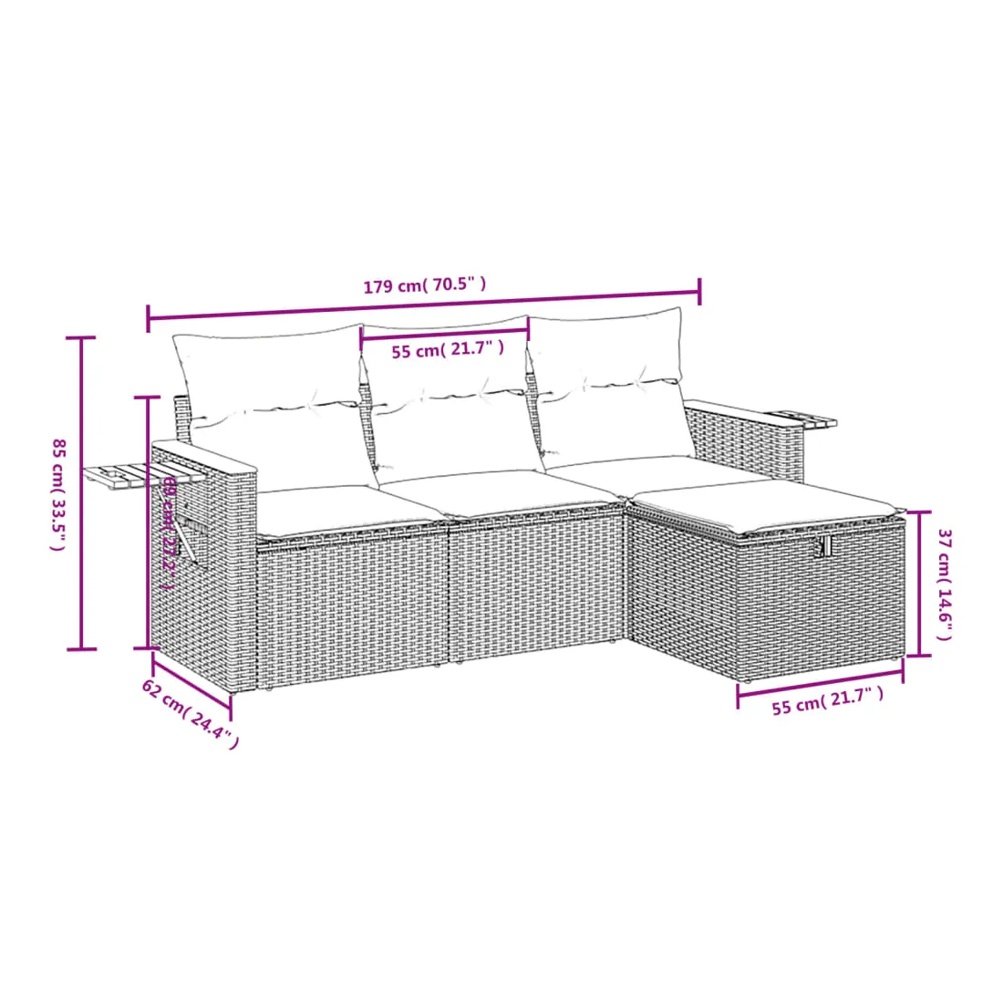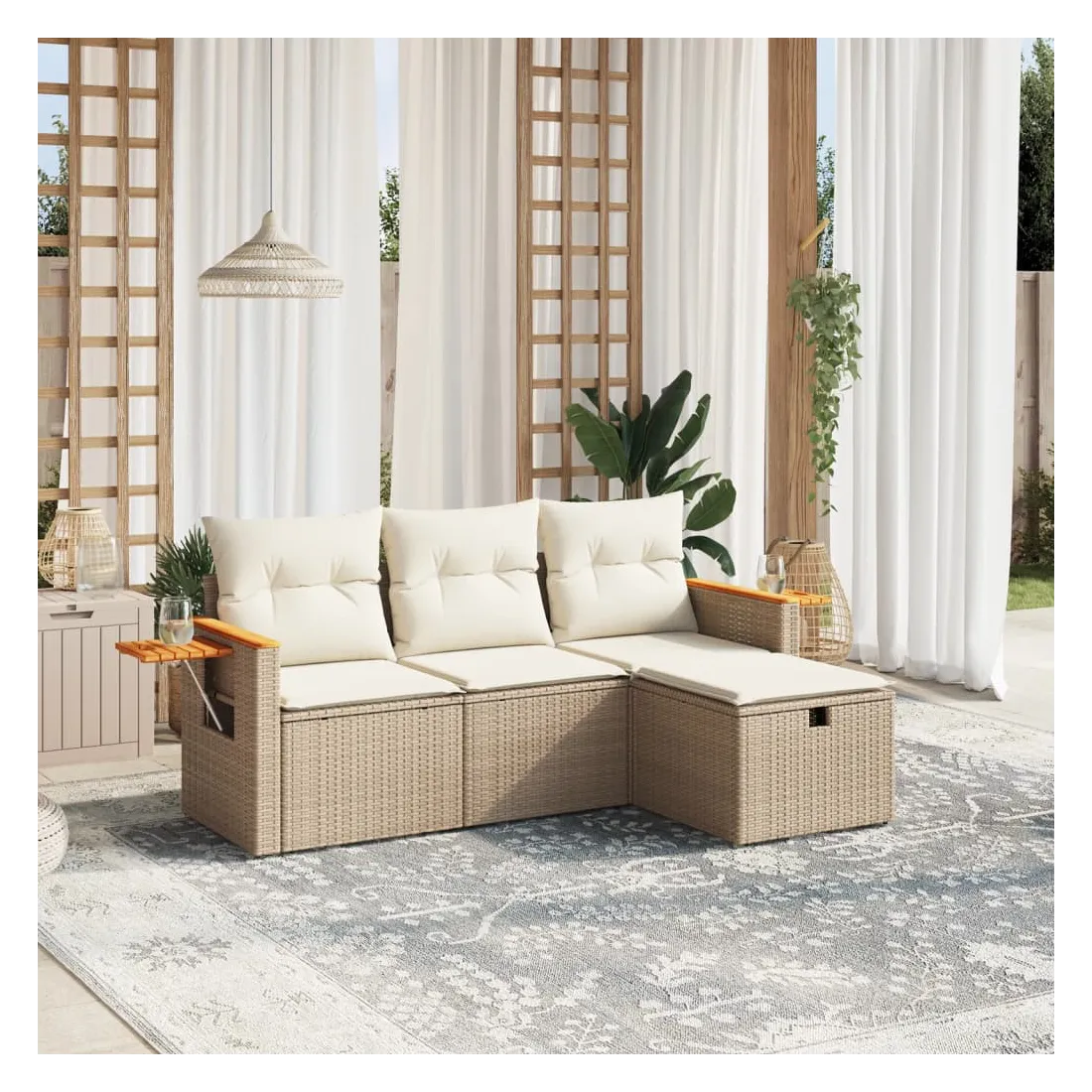 Cet ensemble de canapés de jardin est le complément parfait de votre arrière-cour, terrasse ou patio, offrant un espace confortable et accueillant pour discuter avec la famille et les amis ou simplement se détendre et profiter de l'extérieur. Matériau durable : la résine tressée, également connue sous le nom de poly rotin, est un matériau synthétique solide et nécessitant peu d'entretien qui ressemble au rotin naturel. Il est léger, facile à nettoyer et couramment utilisé pour les meubles d'extérieur en raison de sa durabilité et de ses propriétés de résistance aux intempéries.Expérience d'assise confortable : ce mobilier d'extérieur, doté de coussins épais, offre une expérience d'assise confortable.Housse amovible et lavable : ces coussins de siège sont dotés de housses amovibles pour un lavage et un entretien faciles.Cadre robuste et stable : le cadre en acier enduit de poudre assure la solidité et la stabilité du meuble de jardin pour une utilisation quotidienne à l'extérieur.Conception modulaire : cet ensemble de meubles d'extérieur a une conception modulaire, ce qui le rend complètement flexible et facile à déplacer, afin que vous puissiez créer un agencement de meubles d'extérieur personnalisé. Bon à savoir :Pour que vos meubles d'extérieur restent beaux, nous vous recommandons de les protéger avec une housse imperméable.