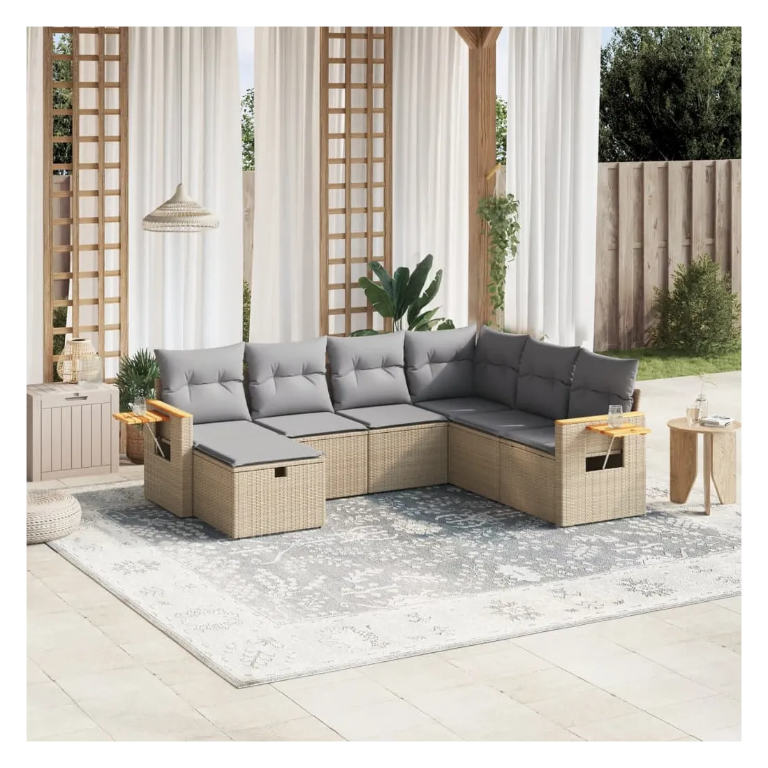 Cet ensemble de canapés de jardin est le complément parfait de votre arrière-cour, terrasse ou patio, offrant un espace confortable et accueillant pour discuter avec la famille et les amis ou simplement se détendre et profiter de l'extérieur. Matériau durable : la résine tressée, également connue sous le nom de poly rotin, est un matériau synthétique solide et nécessitant peu d'entretien qui ressemble au rotin naturel. Il est léger, facile à nettoyer et couramment utilisé pour les meubles d'extérieur en raison de sa durabilité et de ses propriétés de résistance aux intempéries.Expérience d'assise confortable : ce mobilier d'extérieur, doté de coussins épais, offre une expérience d'assise confortable.Housse amovible et lavable : ces coussins de siège sont dotés de housses amovibles pour un lavage et un entretien faciles.Cadre robuste et stable : le cadre en acier enduit de poudre assure la solidité et la stabilité du meuble de jardin pour une utilisation quotidienne à l'extérieur.Conception modulaire : cet ensemble de meubles d'extérieur a une conception modulaire, ce qui le rend complètement flexible et facile à déplacer, afin que vous puissiez créer un agencement de meubles d'extérieur personnalisé. Bon à savoir :Pour que vos meubles d'extérieur restent beaux, nous vous recommandons de les protéger avec une housse imperméable.