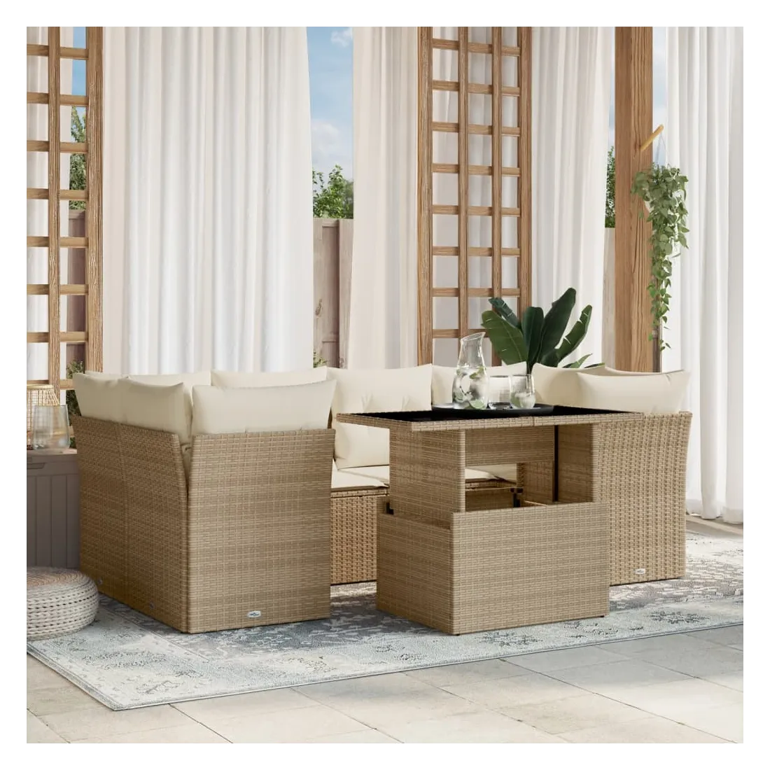 Cet ensemble de canapés de jardin est le complément parfait de votre arrière-cour, terrasse ou patio, offrant un espace confortable et accueillant pour discuter avec la famille et les amis ou simplement se détendre et profiter de l'extérieur. Matériau durable : la résine tressée, également connue sous le nom de poly rotin, est un matériau synthétique solide et nécessitant peu d'entretien qui ressemble au rotin naturel. Il est léger, facile à nettoyer et couramment utilisé pour les meubles d'extérieur en raison de sa durabilité et de ses propriétés de résistance aux intempéries.Dessus de table réglable : le dessus de table peut être soulevé pour rendre la table plus haute, ce qui transforme la table d'extérieur d'une table basse à une table de salle à manger. Elle est parfaite pour recevoir des invités ou prendre des repas à l'extérieur.Expérience d'assise confortable : ce mobilier d'extérieur, doté de coussins épais, offre une expérience d'assise confortable.Housse amovible et lavable : ces coussins de siège sont dotés de housses amovibles pour un lavage et un entretien faciles.Conception modulaire : cet ensemble de meubles d'extérieur a une conception modulaire, ce qui le rend complètement flexible et facile à déplacer, afin que vous puissiez créer un agencement de meubles d'extérieur personnalisé. Bon à savoir :Pour que vos meubles d'extérieur restent beaux, nous vous recommandons de les protéger avec une housse imperméable.