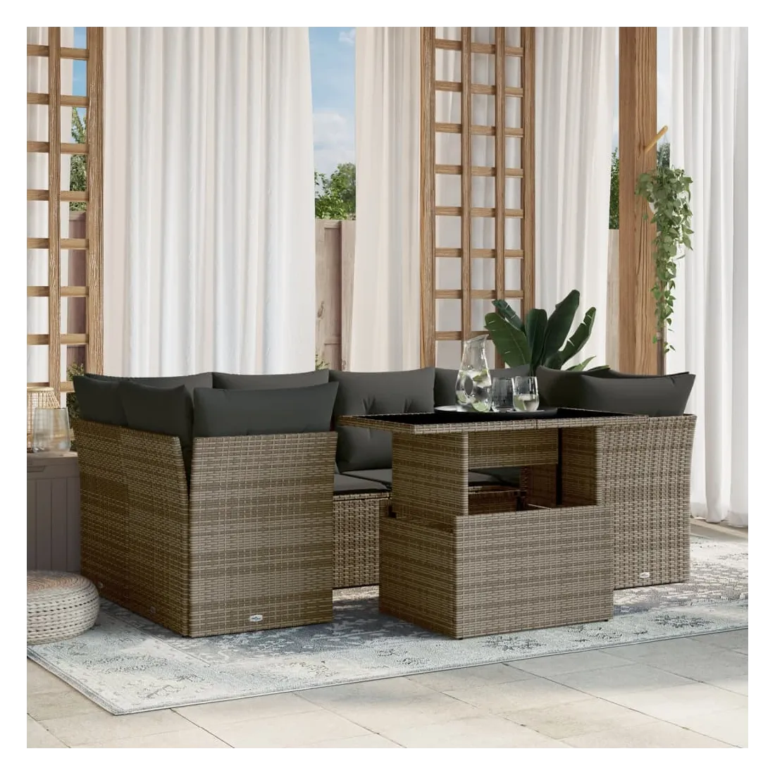 Cet ensemble de canapés de jardin est le complément parfait de votre arrière-cour, terrasse ou patio, offrant un espace confortable et accueillant pour discuter avec la famille et les amis ou simplement se détendre et profiter de l'extérieur. Matériau durable : la résine tressée, également connue sous le nom de poly rotin, est un matériau synthétique solide et nécessitant peu d'entretien qui ressemble au rotin naturel. Il est léger, facile à nettoyer et couramment utilisé pour les meubles d'extérieur en raison de sa durabilité et de ses propriétés de résistance aux intempéries.Dessus de table réglable : le dessus de table peut être soulevé pour rendre la table plus haute, ce qui transforme la table d'extérieur d'une table basse à une table de salle à manger. Elle est parfaite pour recevoir des invités ou prendre des repas à l'extérieur.Expérience d'assise confortable : ce mobilier d'extérieur, doté de coussins épais, offre une expérience d'assise confortable.Housse amovible et lavable : ces coussins de siège sont dotés de housses amovibles pour un lavage et un entretien faciles.Conception modulaire : cet ensemble de meubles d'extérieur a une conception modulaire, ce qui le rend complètement flexible et facile à déplacer, afin que vous puissiez créer un agencement de meubles d'extérieur personnalisé. Bon à savoir :Pour que vos meubles d'extérieur restent beaux, nous vous recommandons de les protéger avec une housse imperméable.