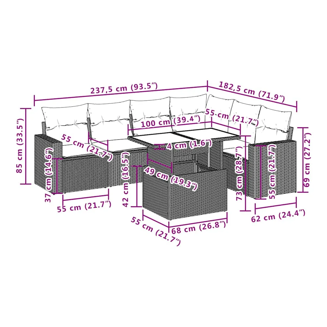 Cet ensemble de canapés de jardin est le complément parfait de votre arrière-cour, terrasse ou patio, offrant un espace confortable et accueillant pour discuter avec la famille et les amis ou simplement se détendre et profiter de l'extérieur. Matériau durable : la résine tressée, également connue sous le nom de poly rotin, est un matériau synthétique solide et nécessitant peu d'entretien qui ressemble au rotin naturel. Il est léger, facile à nettoyer et couramment utilisé pour les meubles d'extérieur en raison de sa durabilité et de ses propriétés de résistance aux intempéries.Dessus de table réglable : le dessus de table peut être soulevé pour rendre la table plus haute, ce qui transforme la table d'extérieur d'une table basse à une table de salle à manger. Elle est parfaite pour recevoir des invités ou prendre des repas à l'extérieur.Expérience d'assise confortable : ce mobilier d'extérieur, doté de coussins épais, offre une expérience d'assise confortable.Housse amovible et lavable : ces coussins de siège sont dotés de housses amovibles pour un lavage et un entretien faciles.Conception modulaire : cet ensemble de meubles d'extérieur a une conception modulaire, ce qui le rend complètement flexible et facile à déplacer, afin que vous puissiez créer un agencement de meubles d'extérieur personnalisé. Bon à savoir :Pour que vos meubles d'extérieur restent beaux, nous vous recommandons de les protéger avec une housse imperméable.
